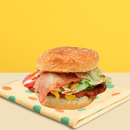 Hamburguesa con tiras crujientes de tocino ahumado y carne jugosa.