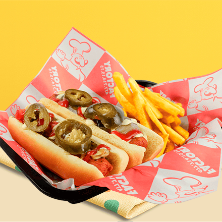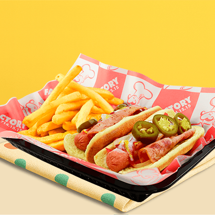 2 pzas de hot dogs, preparados con jitomate, cebolla y chile jalapeño con papas fritas.