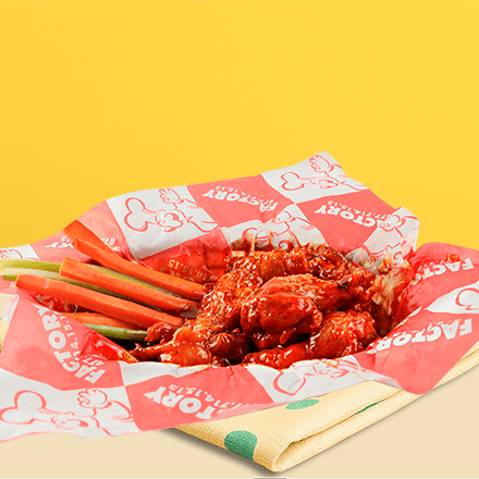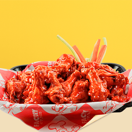 Las auténticas alitas bañadas en la salsa de tú elección con zanahoria y apio.