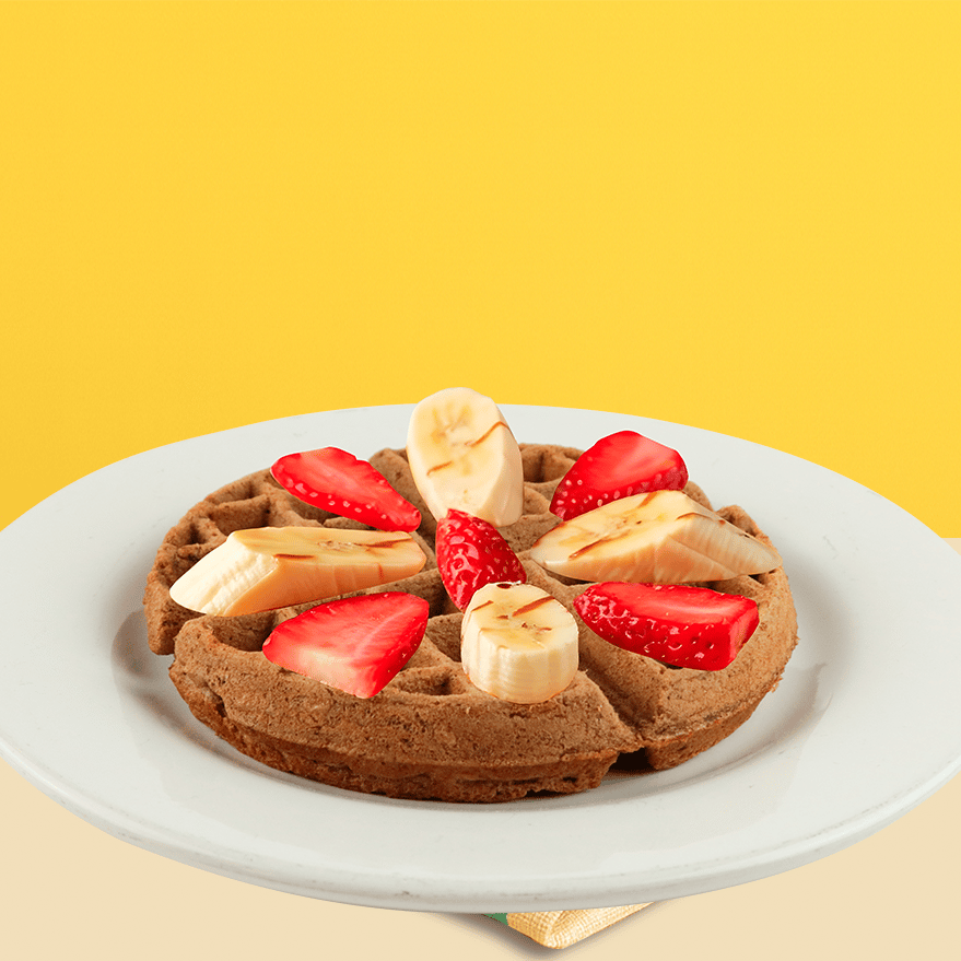 Un waffle preparado con nuestra deliciosa receta de chocolate abuelita, acompañado con plátano y fresa bañado con chocolate o mermelada, o miel maple.