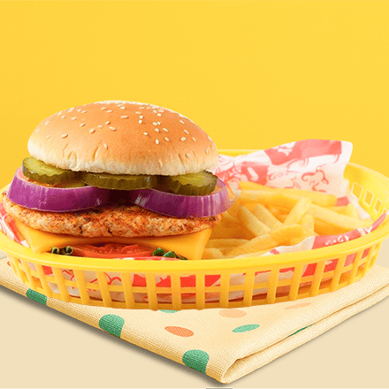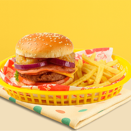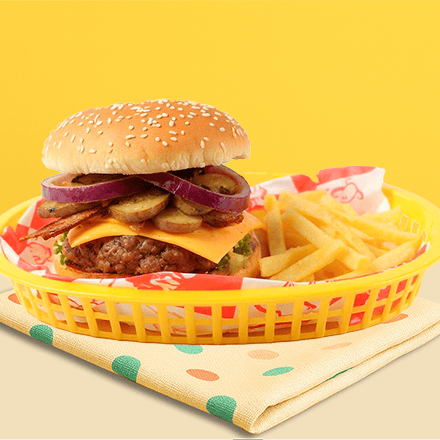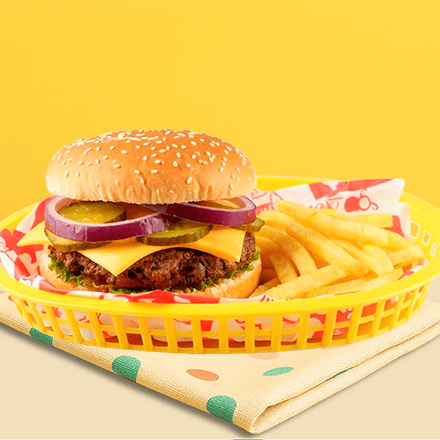 150 gr de jugosa carne, queso cheddar, lechuga italiana, jitomate, cebolla, pepinillos y papas fritas 150 gr