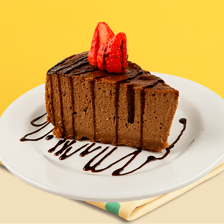 Rebanada de Cheesecake de chocolate cremoso con intenso sabor a cacao y base de galleta.