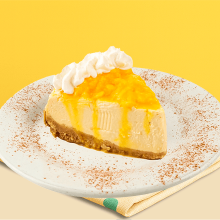 Rebanada de Cheesecake cremoso con base de galleta y suave glase de durazno.