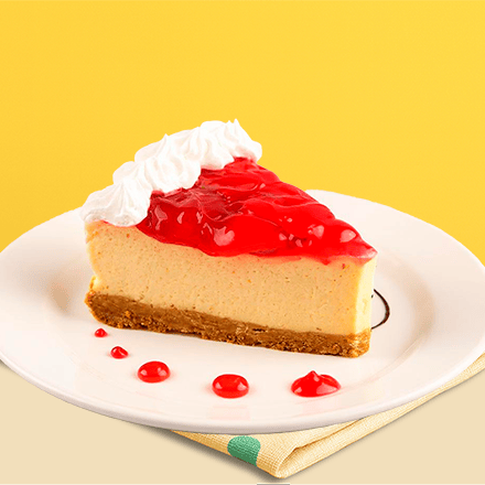 Rebanada de Pay de queso cremoso con base de galleta y glase de fresa.