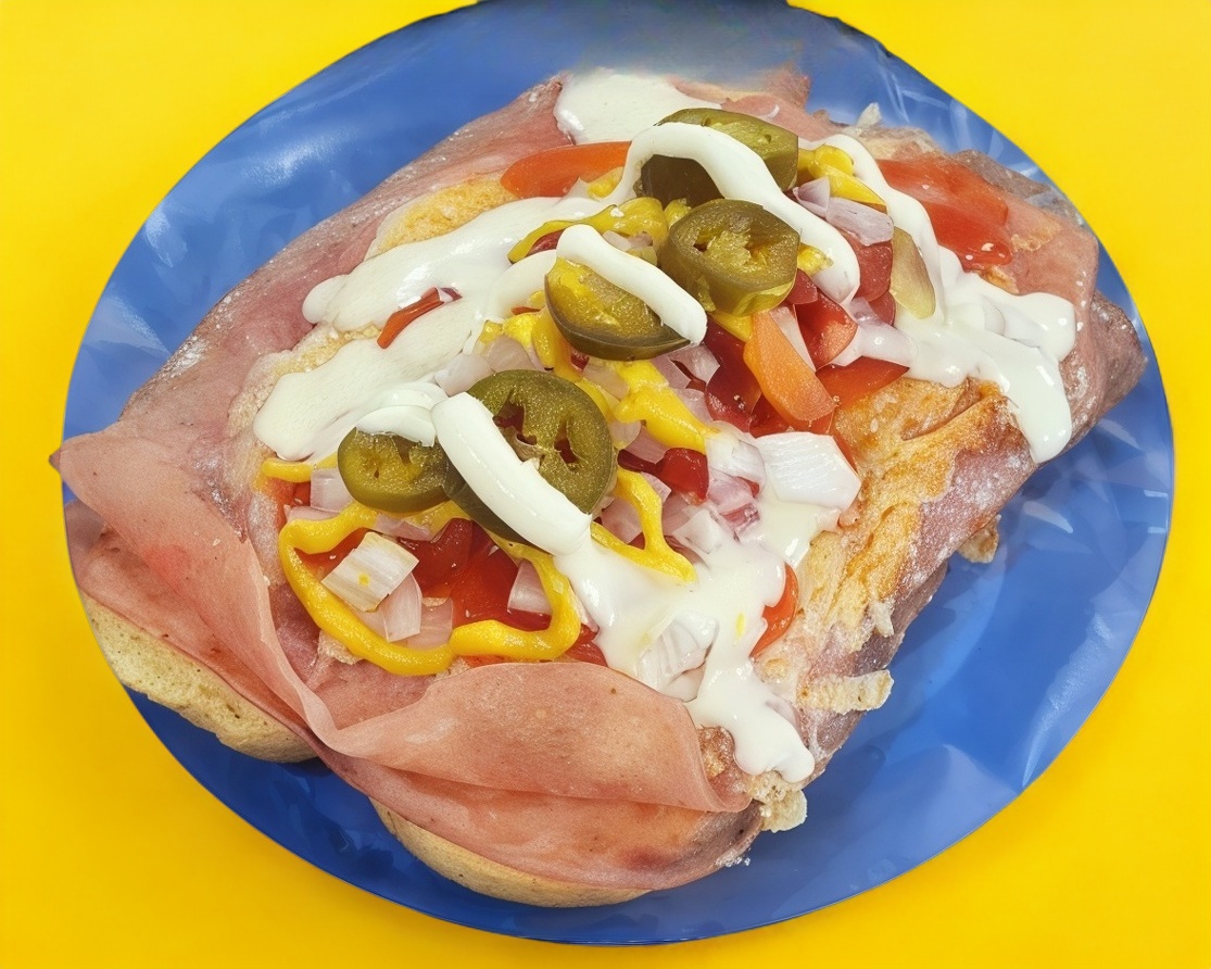 Jamón, queso blanco y amarillo, jitomate, cebolla, cátsup, mostaza y chile.