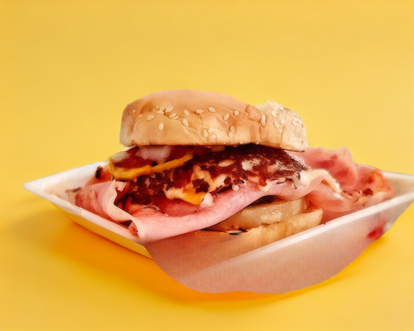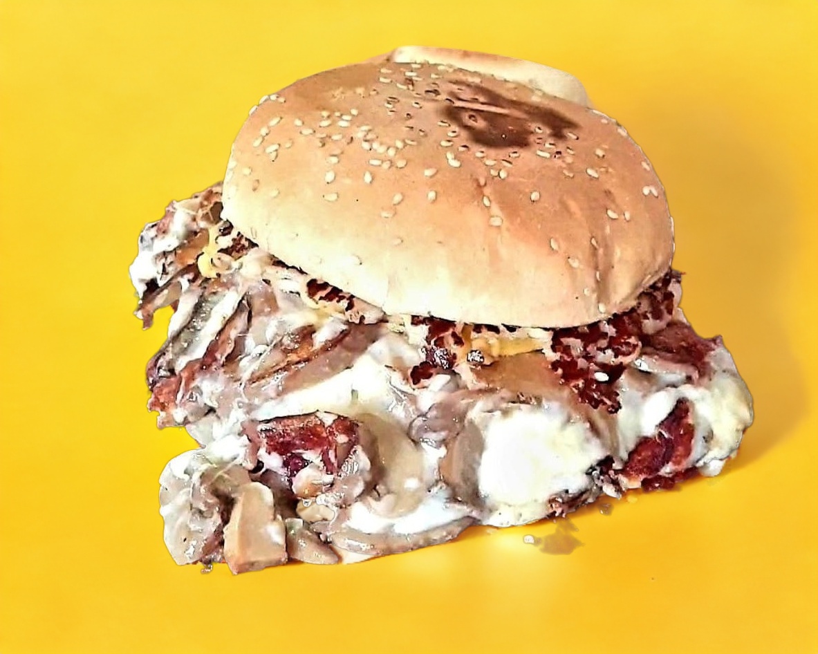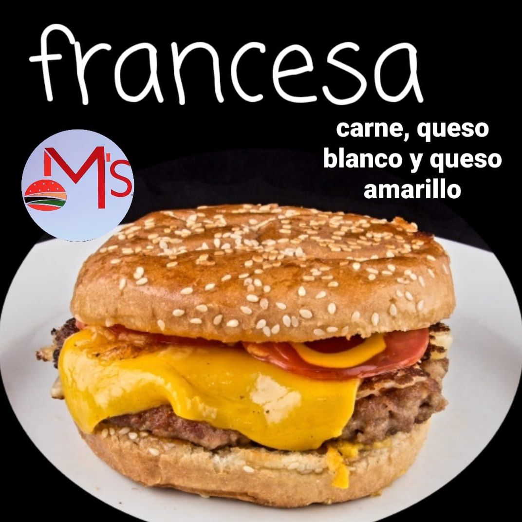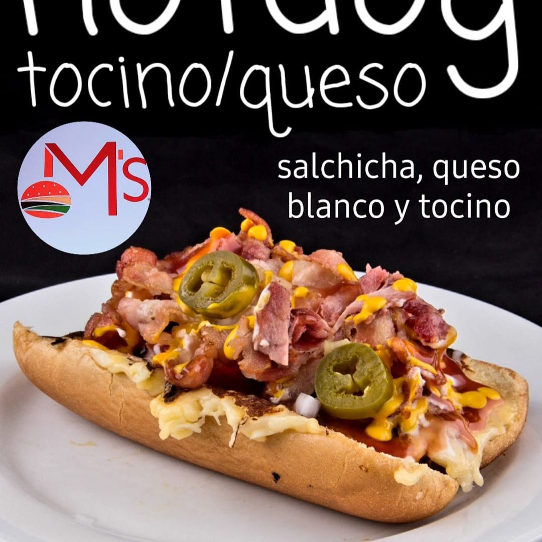 Carne 90gr, 6 rebanadas de tocino, queso blanco, jitomate, cebolla, cátsup, mostaza y chile.