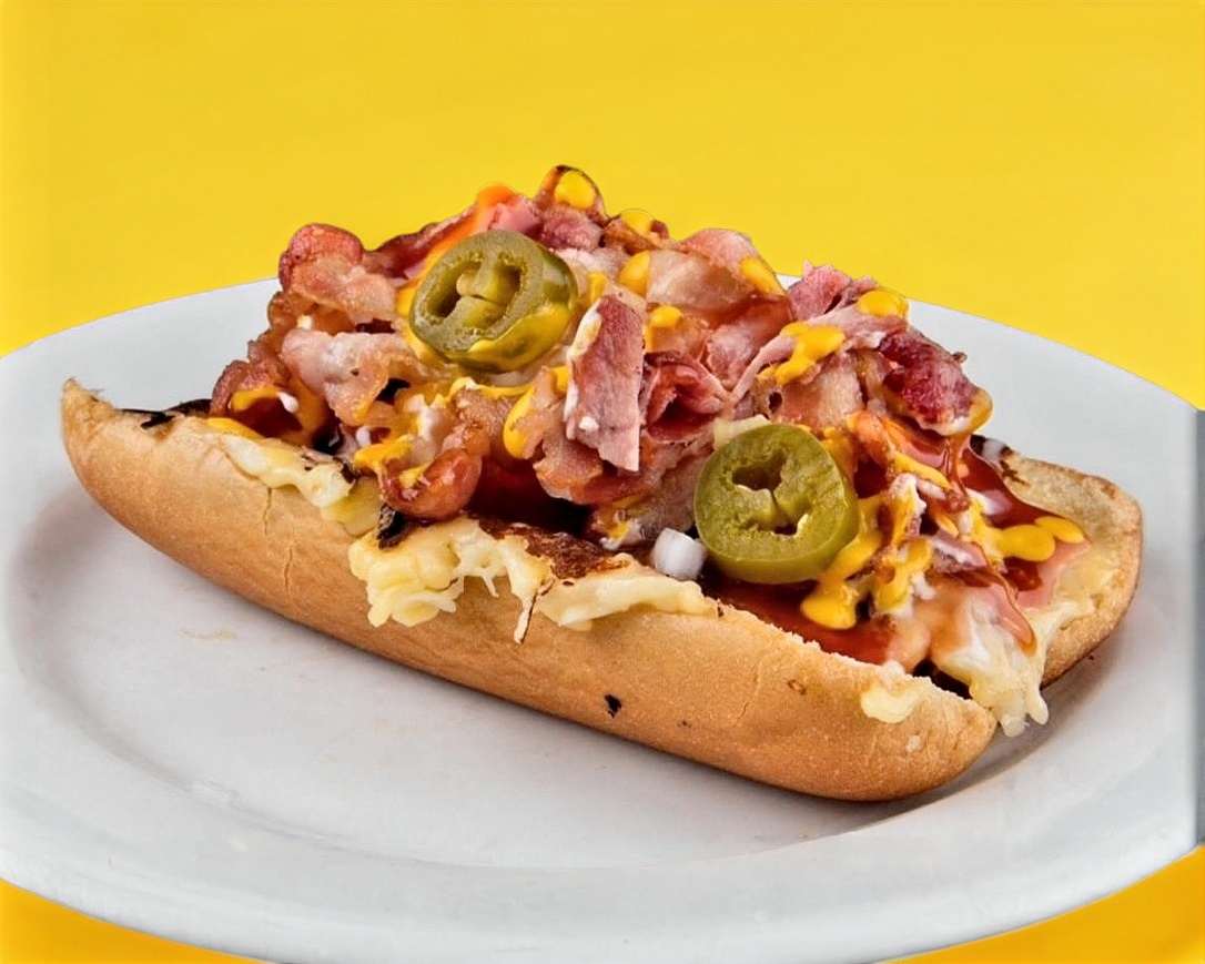 Salchicha de pavo, tocino, queso blanco, jitomate, cebolla, cátsup, mostaza crema y chile.