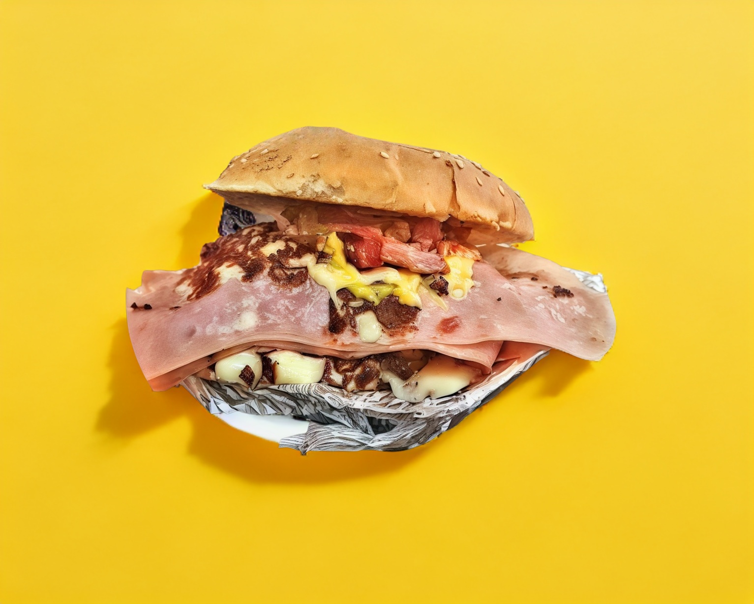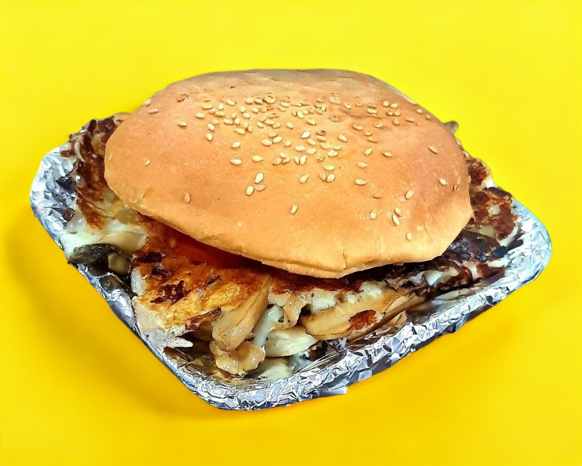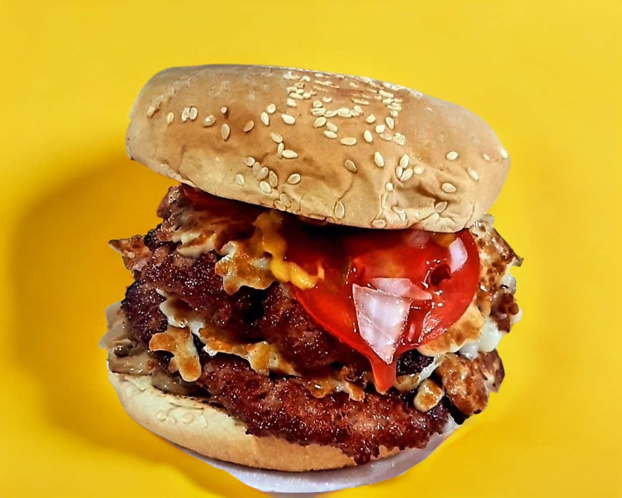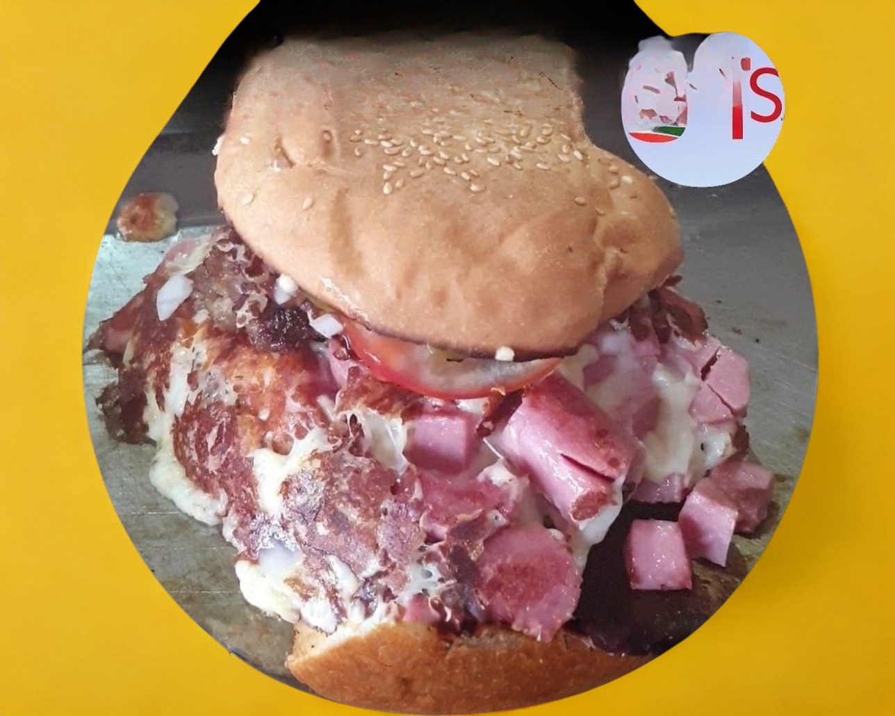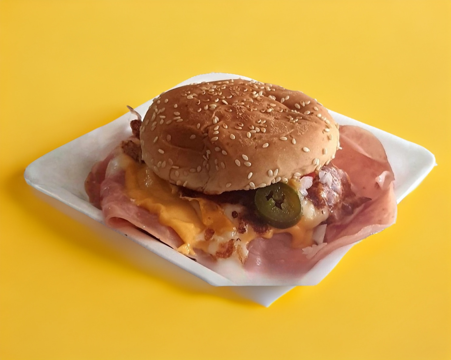 Carne doble, salchicha, doble queso blanco jitomate, cebolla, cátsup, mostaza y chile.