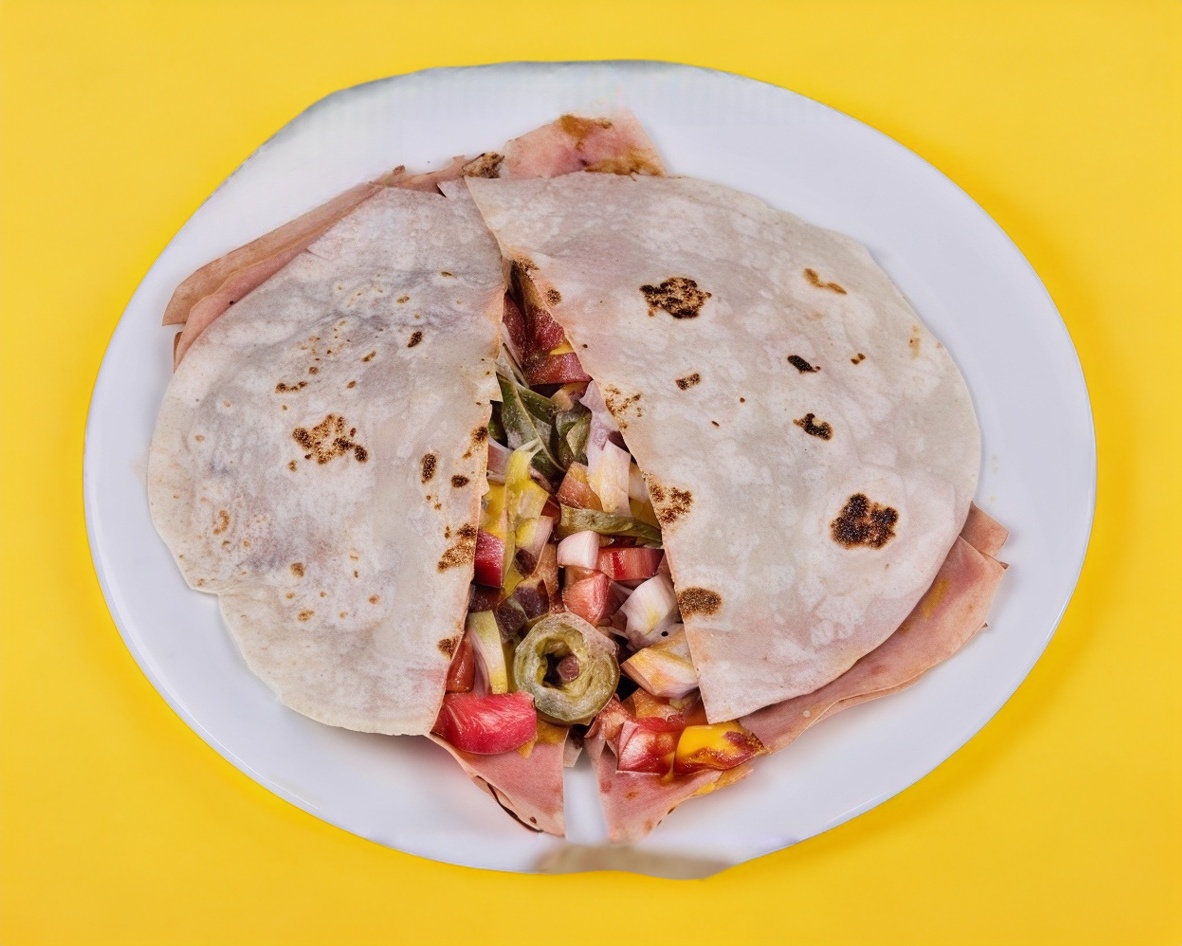 Tortilla de harina, jamón, queso blanco, queso amarillo, jitomate, cebolla, cátsup, mostaza y chile.