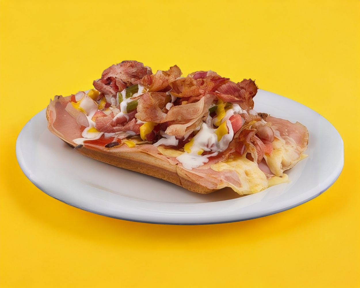 Carne, jamón, tocino, piña, salchicha, queso blanco y amarillo, jitomate, cebolla, cátsup, mostaza y chile.