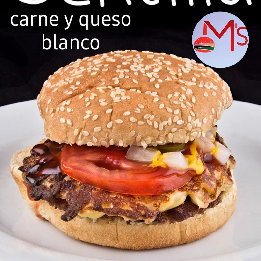 Doble carne, queso blanco, jitomate, cebolla, cátsup, mostaza y chile.
