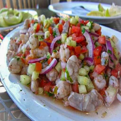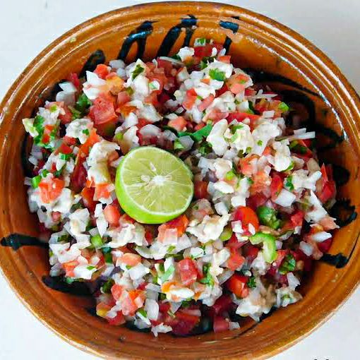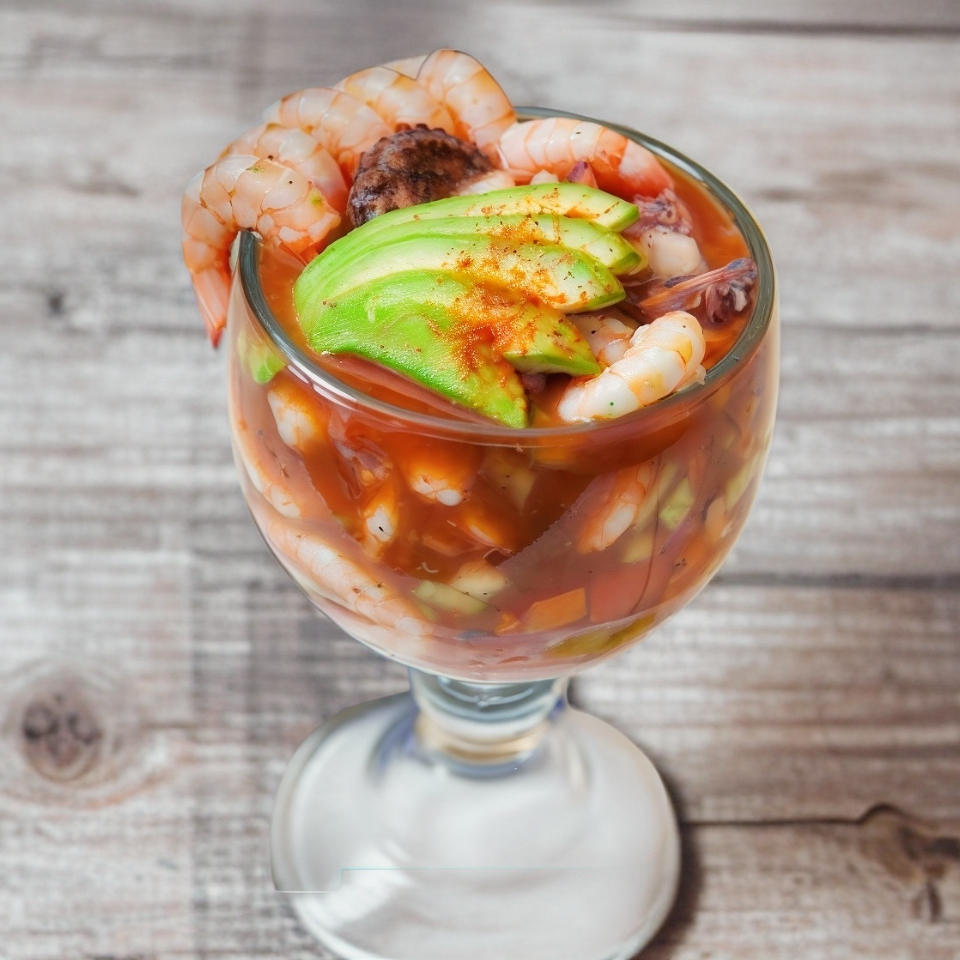 Pulpo, camarón, marlín, sal, chiltepin original de sinaloa, limón, cebolla morada, jitomate, aguacate y pimienta.