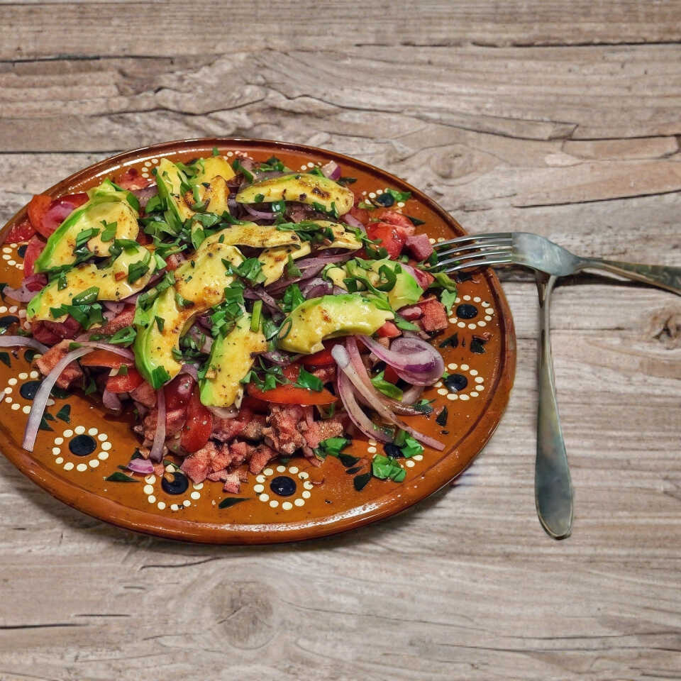 Marlón ahumado a la leña de mangle, sal, chiltepin original de sinaloa, limón, cebolla morada, jitomate, aguacate y pimienta.