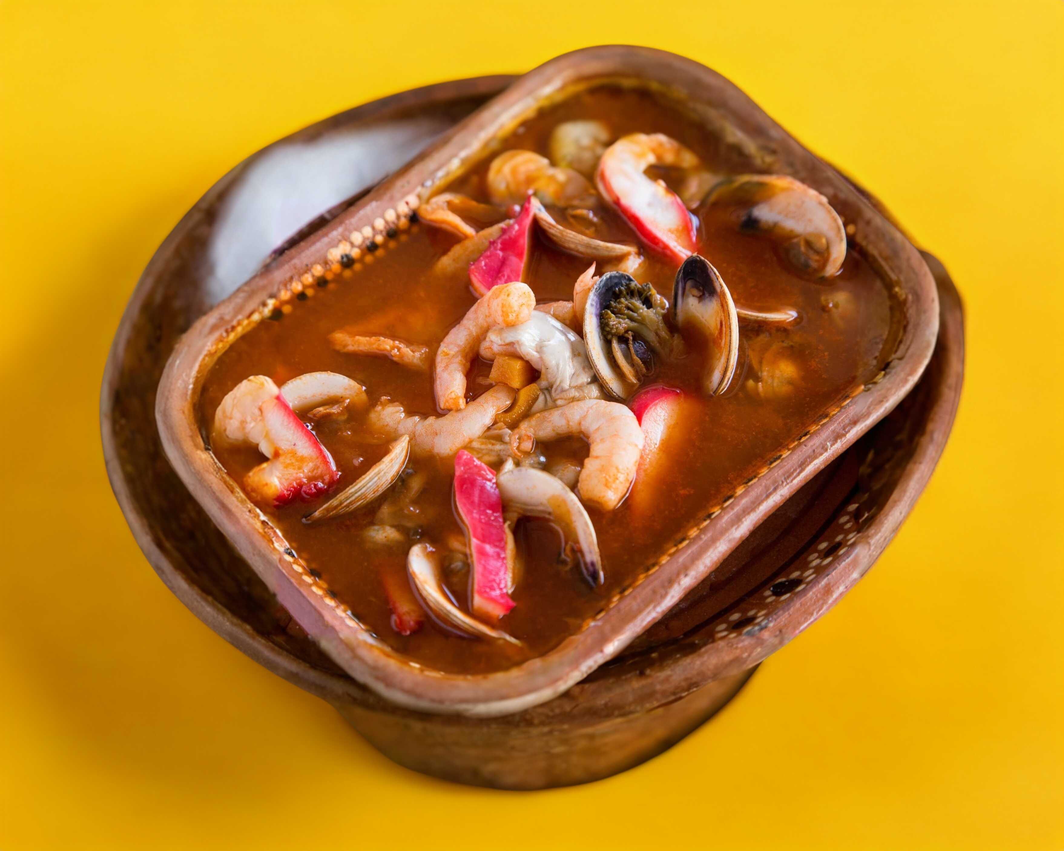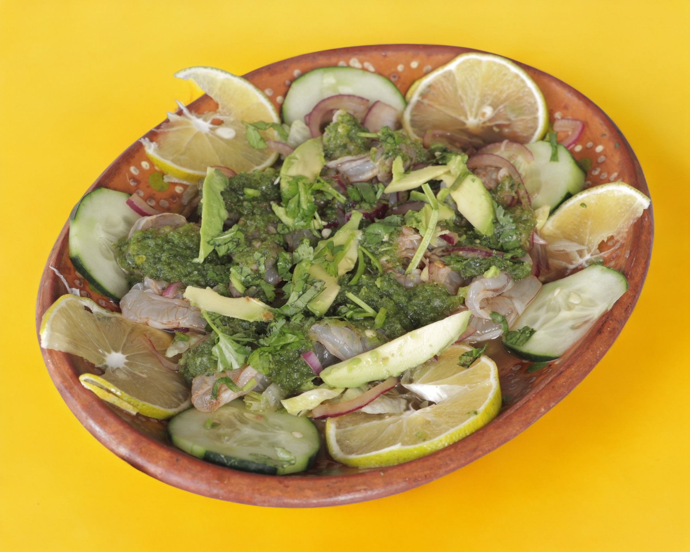 Mariscos, cebolla, aguacate, serrano, habanero verde, morrón y aceite de oliva