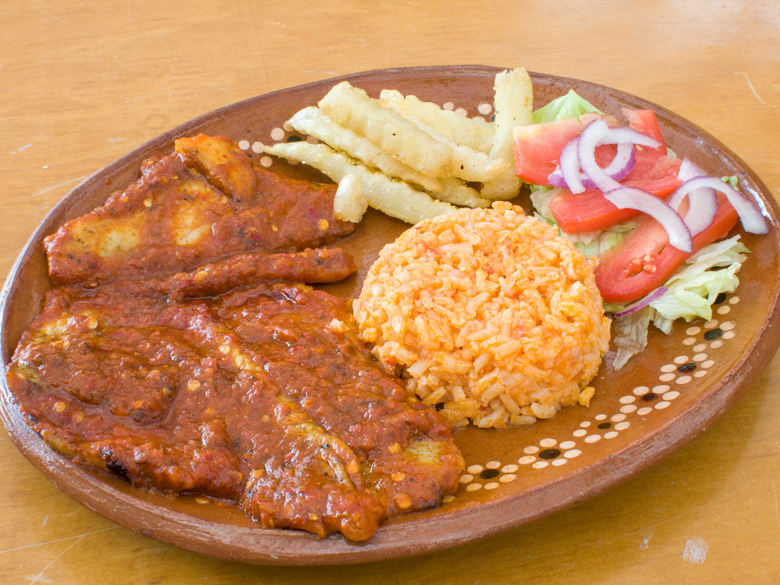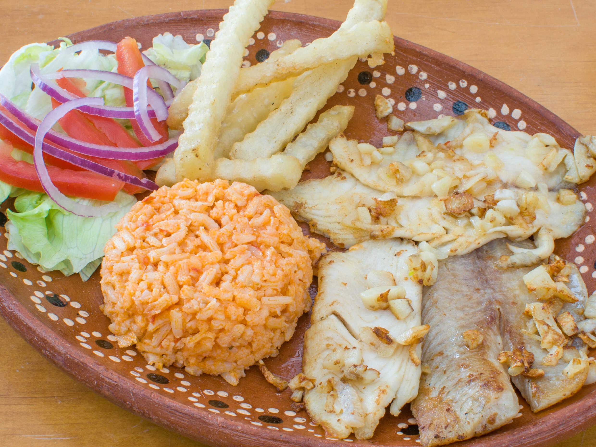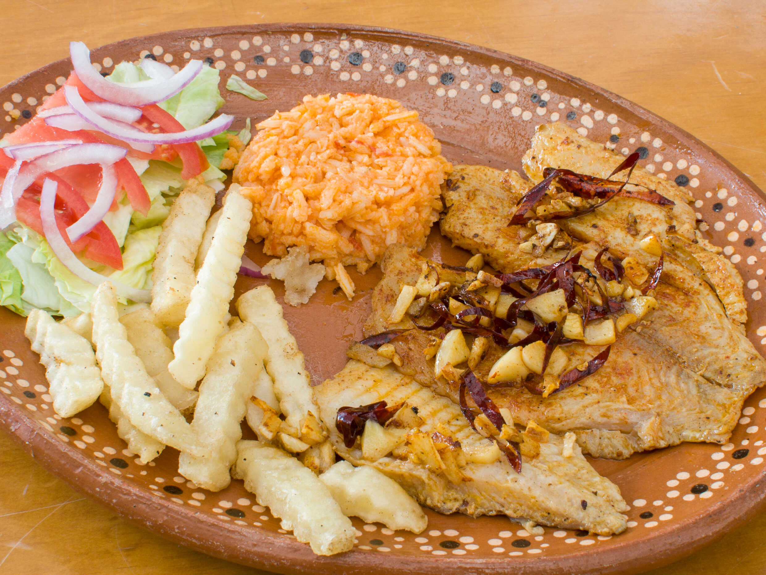 Filete con ajo y chile guajillo acompañado con arroz, papas a la francesa y ensalada.