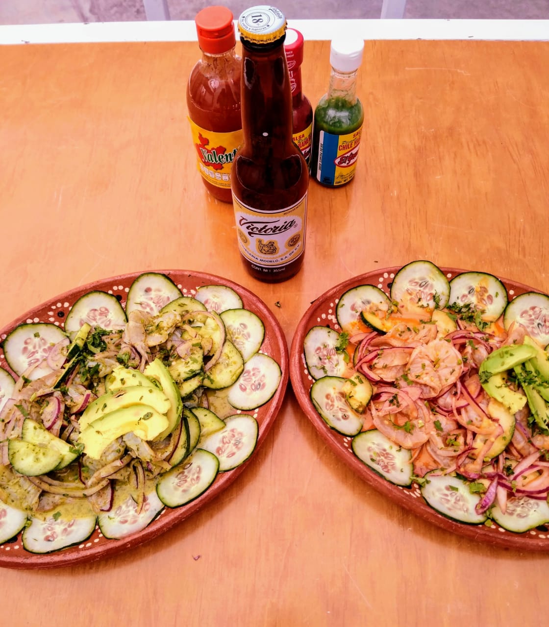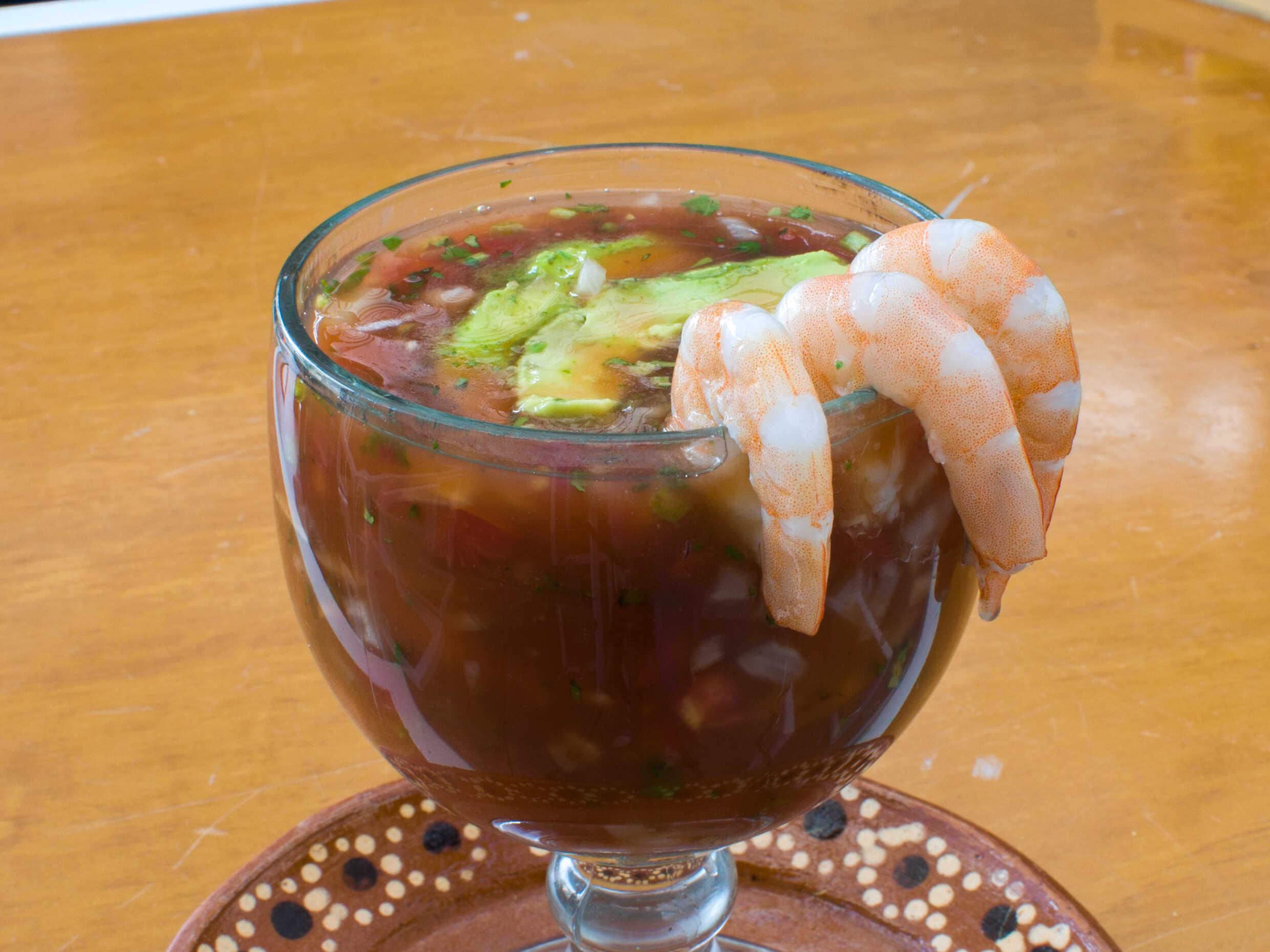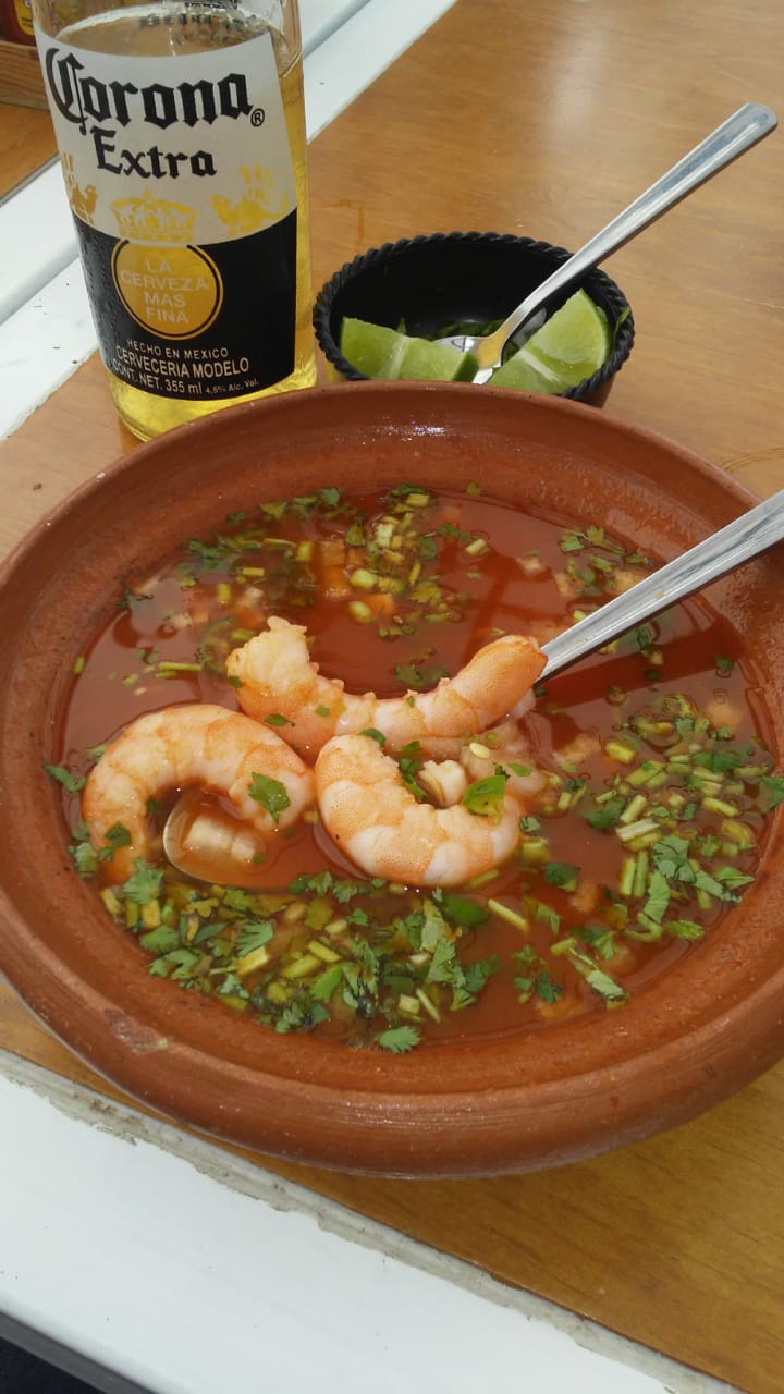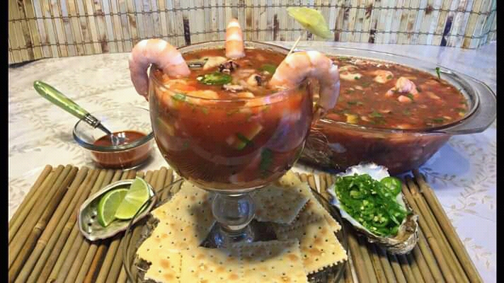 Mix salsas, sal, limón, picante, Tajín, Clamato y camarones.