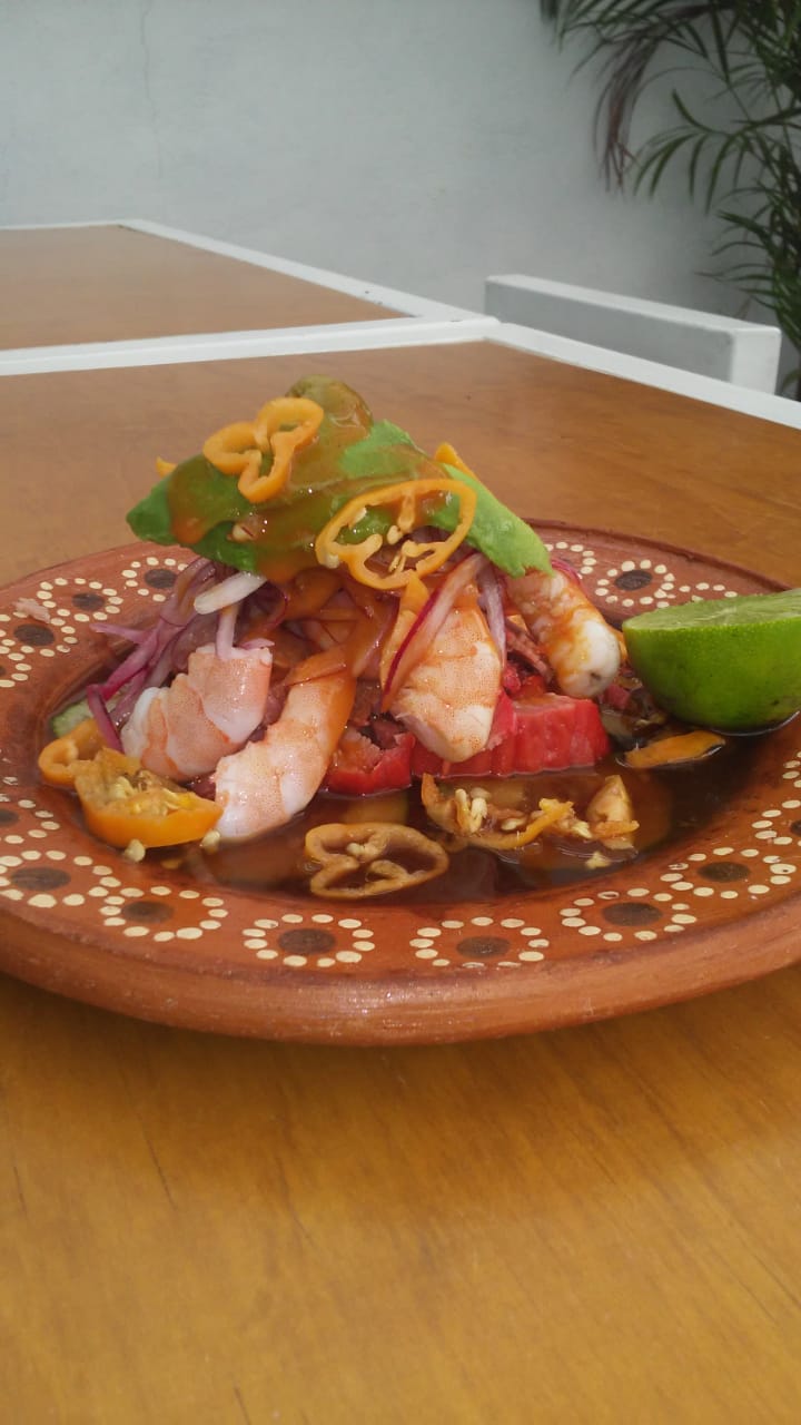 camaron,jitomate,cebolla morada,limon,aguacate,salsa vinagreta