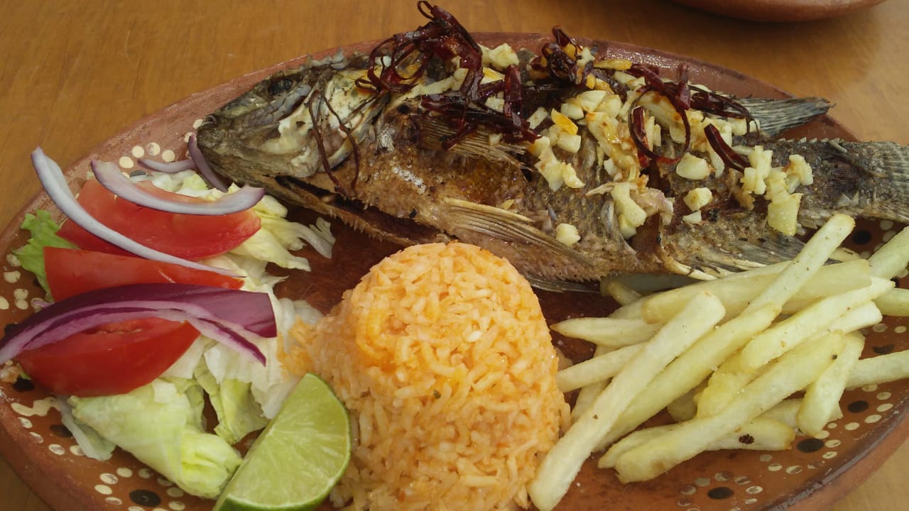Pescado frito bañado en mantequilla ajo y chile guajillo acompañado de arroz ensalada y papas.