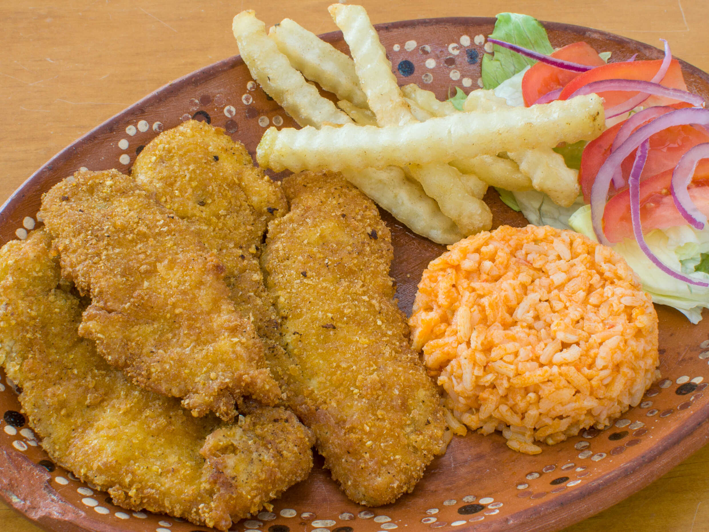 Filete empanizado acompañado de arroz, papas a la francesa y ensalada.