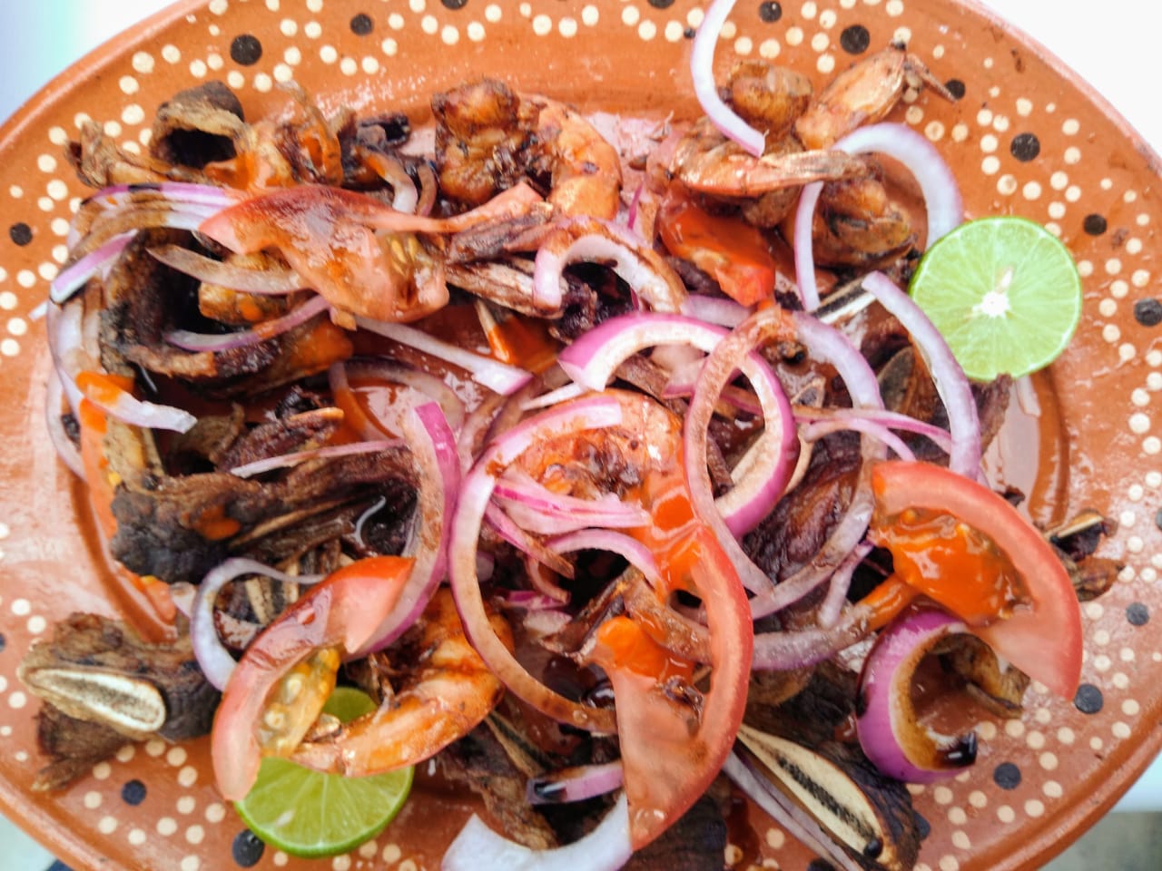 ahujas fritas acompañados de camarones fritos con cebolla morada jitomate y una salsa vinagreta