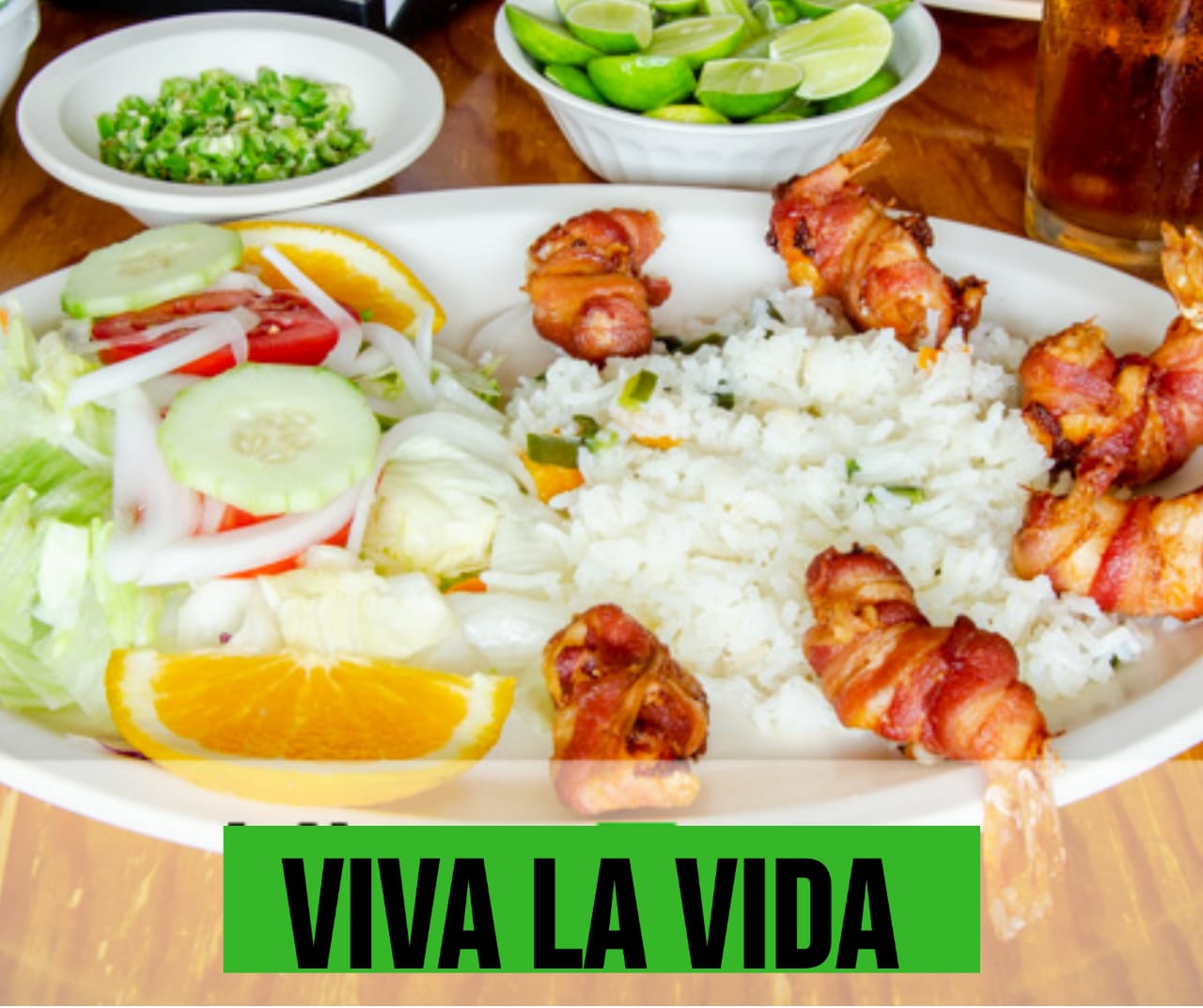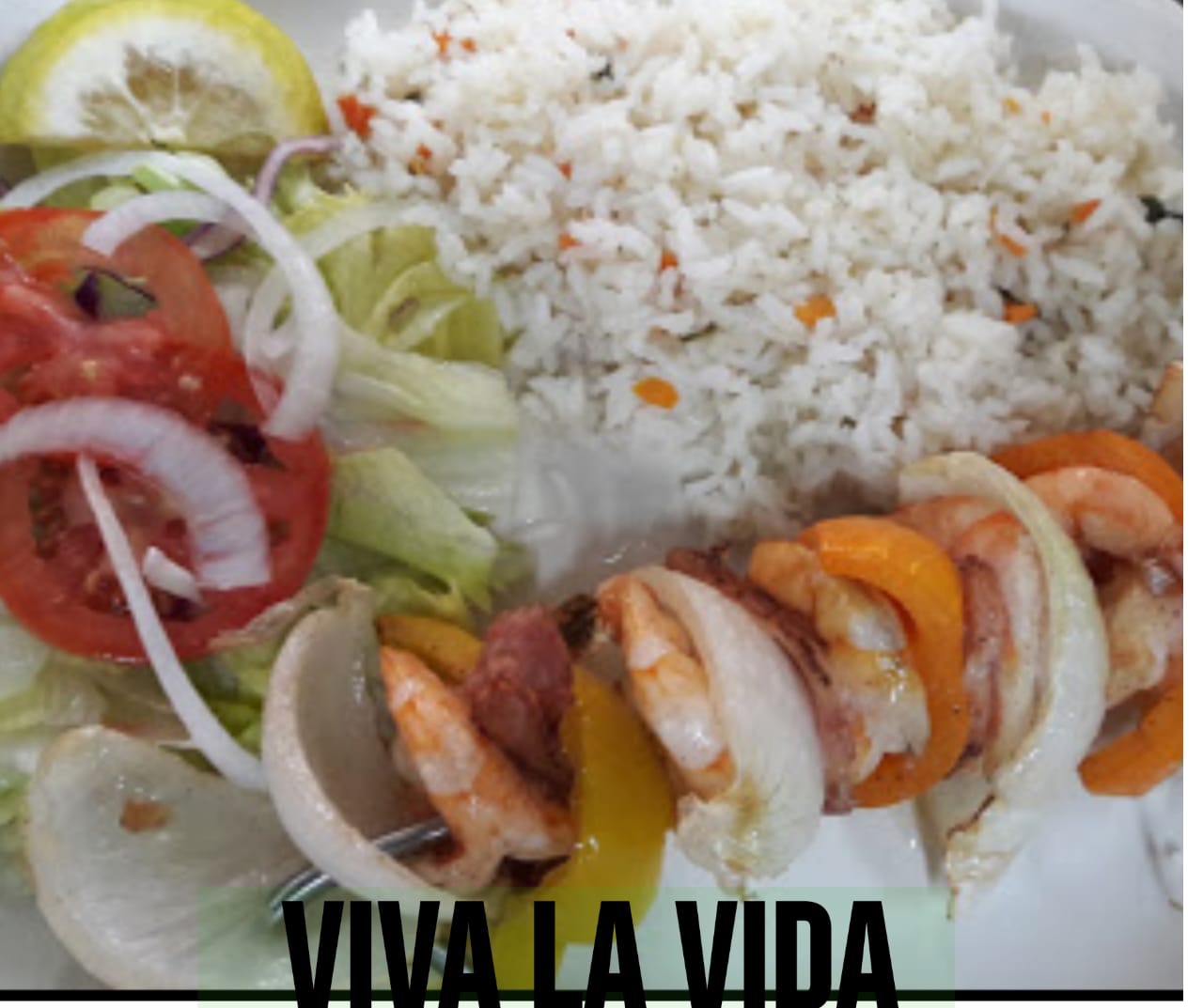 Camarones en una vara con tocino morron cebolla asada