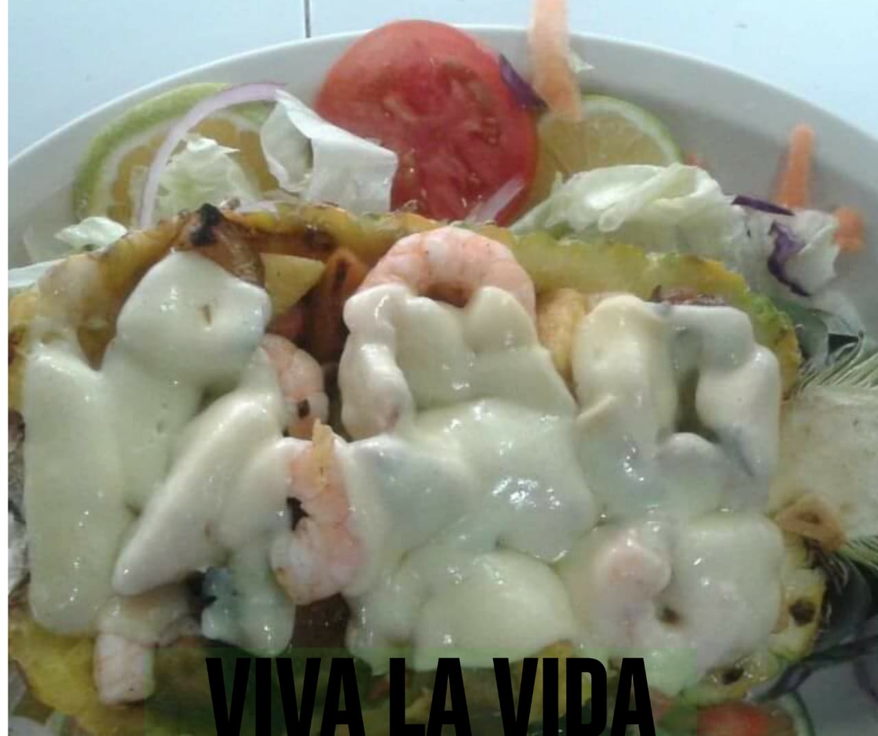 Piña reyena de morron champiñon piña en trozoz camaron con pulpo con una sabana de quezo gratinado