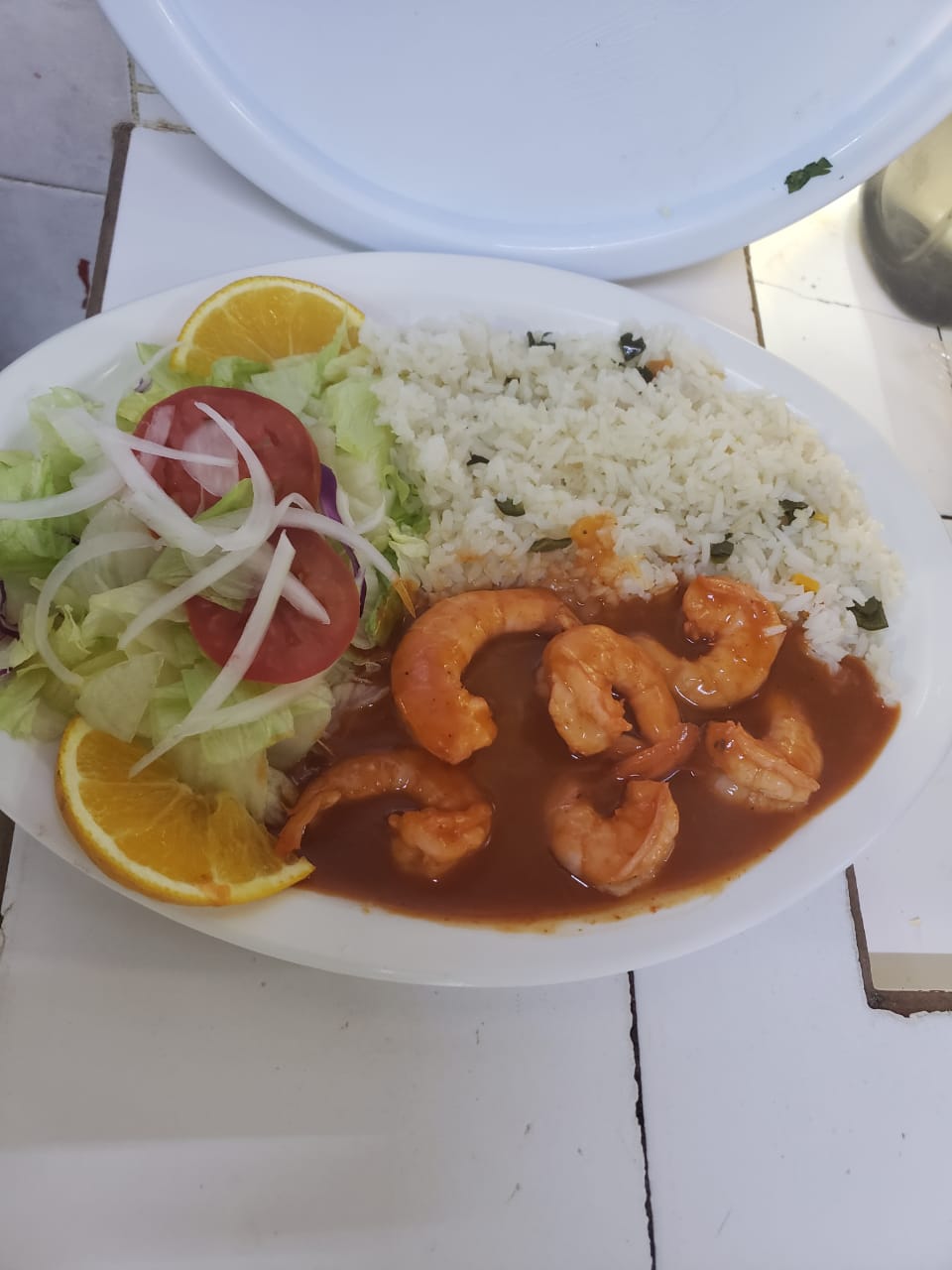 CAMARON GRANDE GUISADO CON SALSA MEDIA DIABLA 6 PIEZAS ICLUYE ARROZ Y ENSALADA