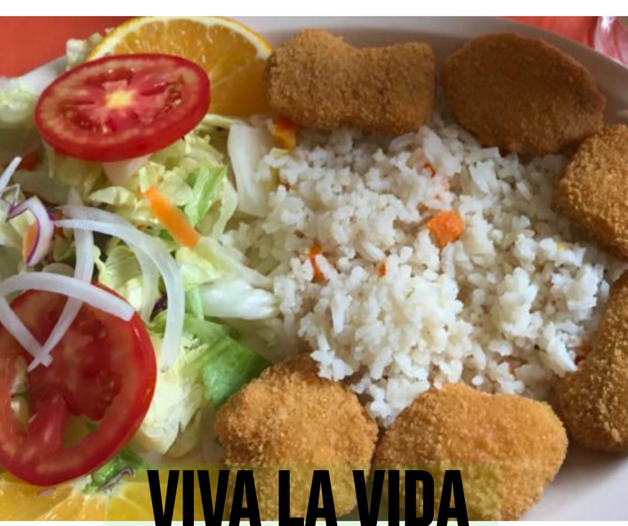 MILANESA DE POLLO EMPANIZADO CON ARROZ Y ENSALADA