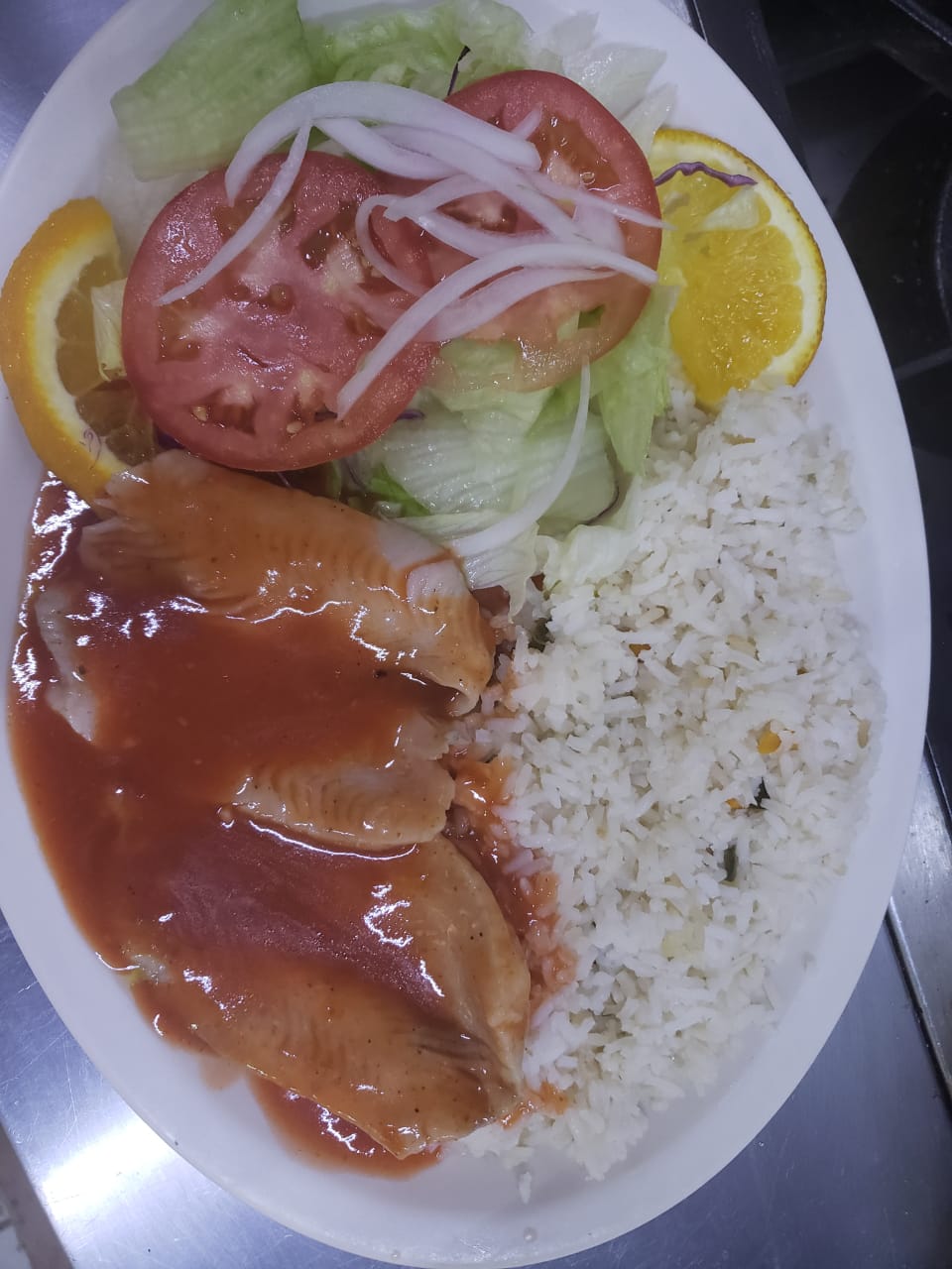 BARA CON CAMARON FILETE CAZON MORRON TOCINO CEBOLLA ACOMPAÑADO DE ARROZ Y ENSALDA