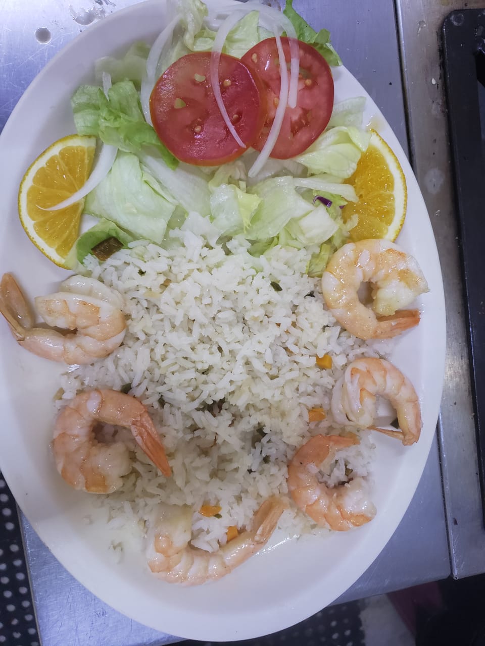 CAMARÓN GRANDE GUISADO CON MORRON CEBOLLA Y UN TOQUE DE SALSA DIABLA 6 PIEZAS INCLUYE ARROZ Y ENSALADA