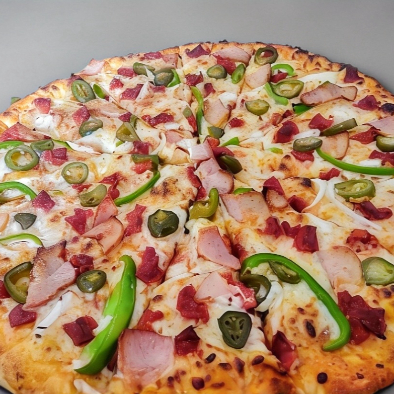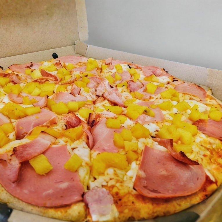 Jamón, salami, champiñón, piña, pimiento verde, cebolla. Elaborada con masa fresca, pasta de tomate condimentada y queso tipo mozzarella.