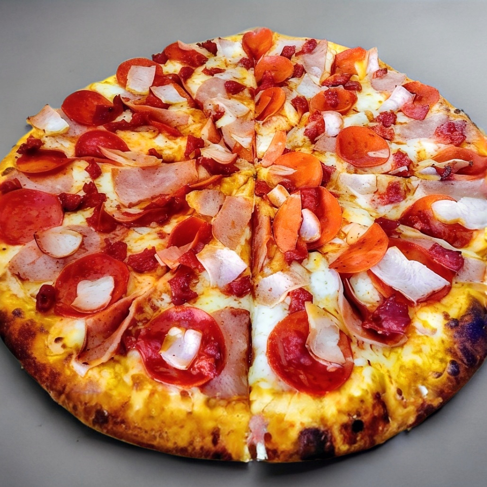 Jamón, salami, salchicha y chorizo. Elaborada con masa fresca, pasta de tomate condimentada y queso tipo mozzarella.