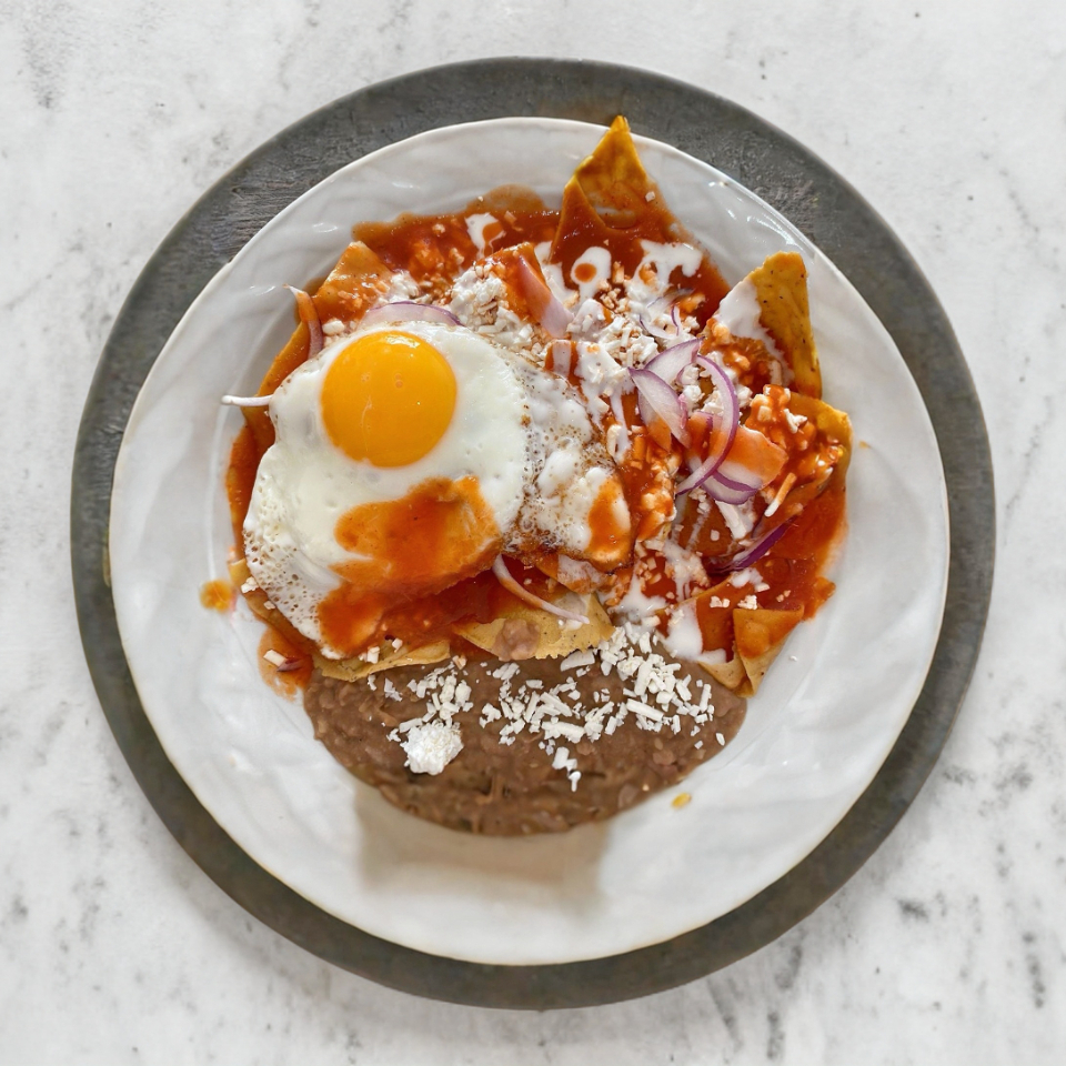 Platillo personal, el cual incluye: chilaquiles verdes o rojos ( 200 a 250 gramos aprox) con frijoles ( 150 gramos)( 50 gr salsa verde y roja ( el cliente puede elegir una sola proteína )