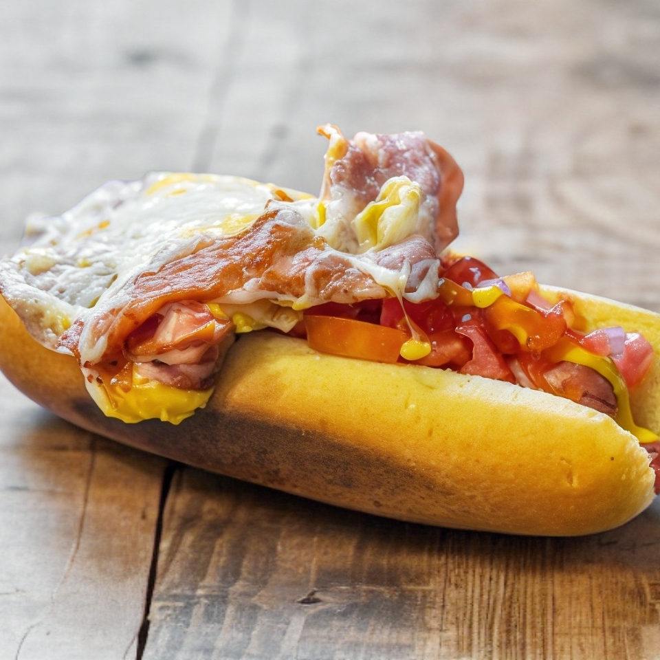 Preparada de salchicha, jamón, queso blanco, queso amarillo, verduras y aderezos.