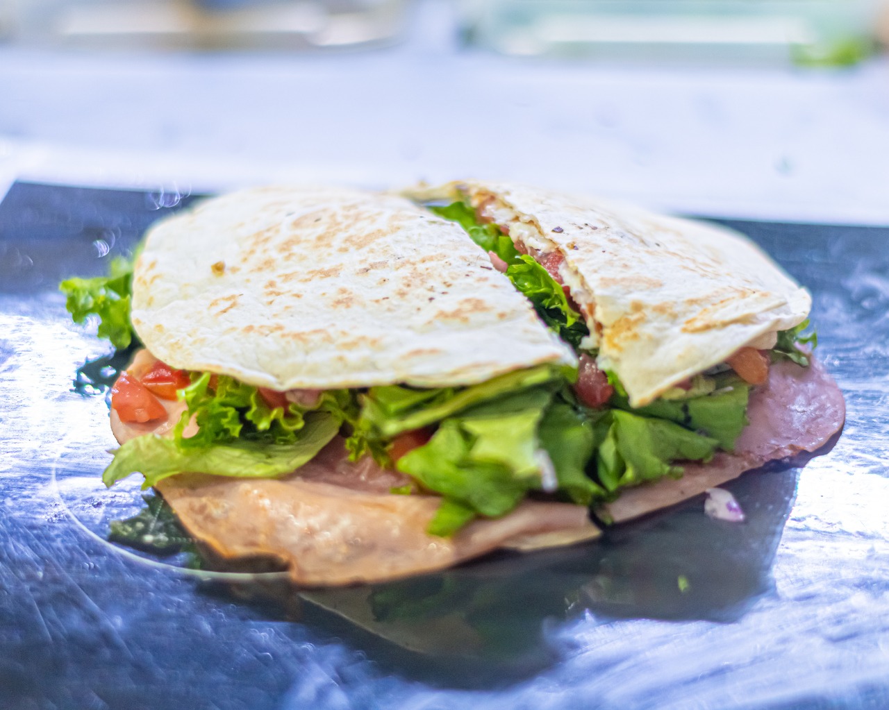 Doble tortilla de harina, jamón, queso blanco, amarillo, verduras y aderezo.