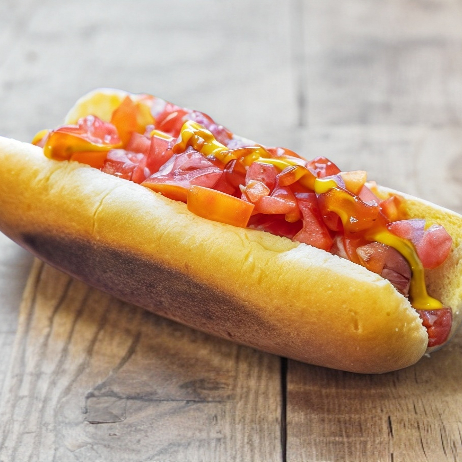 Pan bimbo, salchicha premium de pavo, verdura: jitomate, cebolla, chile jalapeño en rodajas y aderezos: mostaza, cátsup y mayonesa