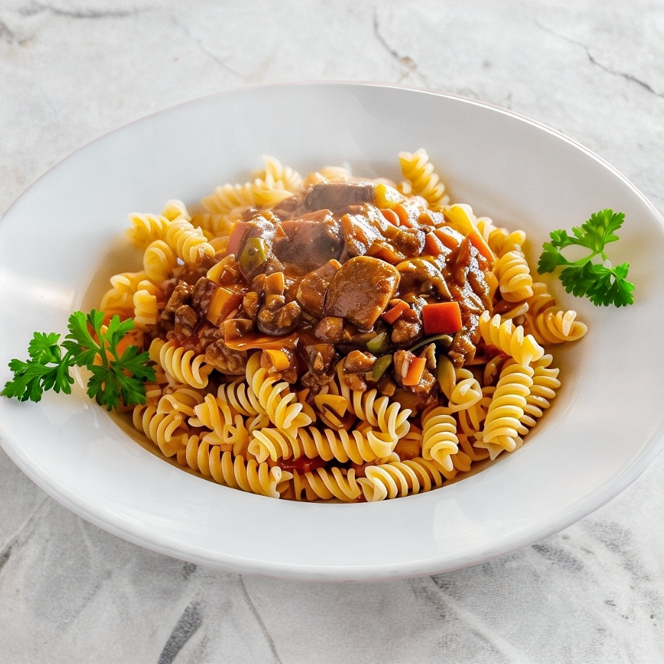Pasta con carne cocida lentamente en salsa de tomate italiana, queso y peregil