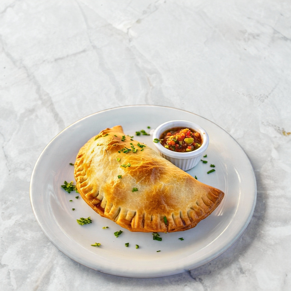 Empanada argetina de masa frita, con peperoi, jamon, queso y salsa italaiiana