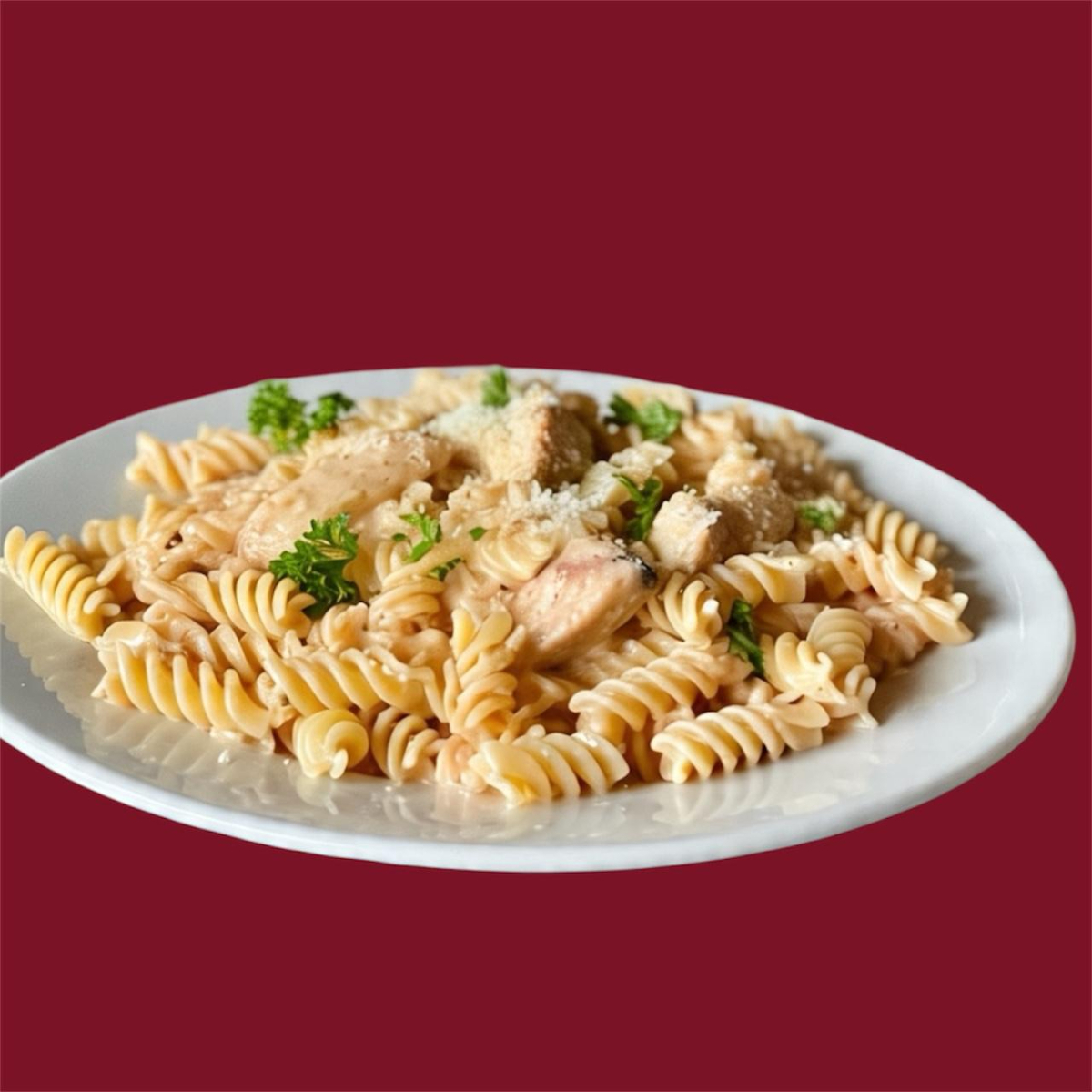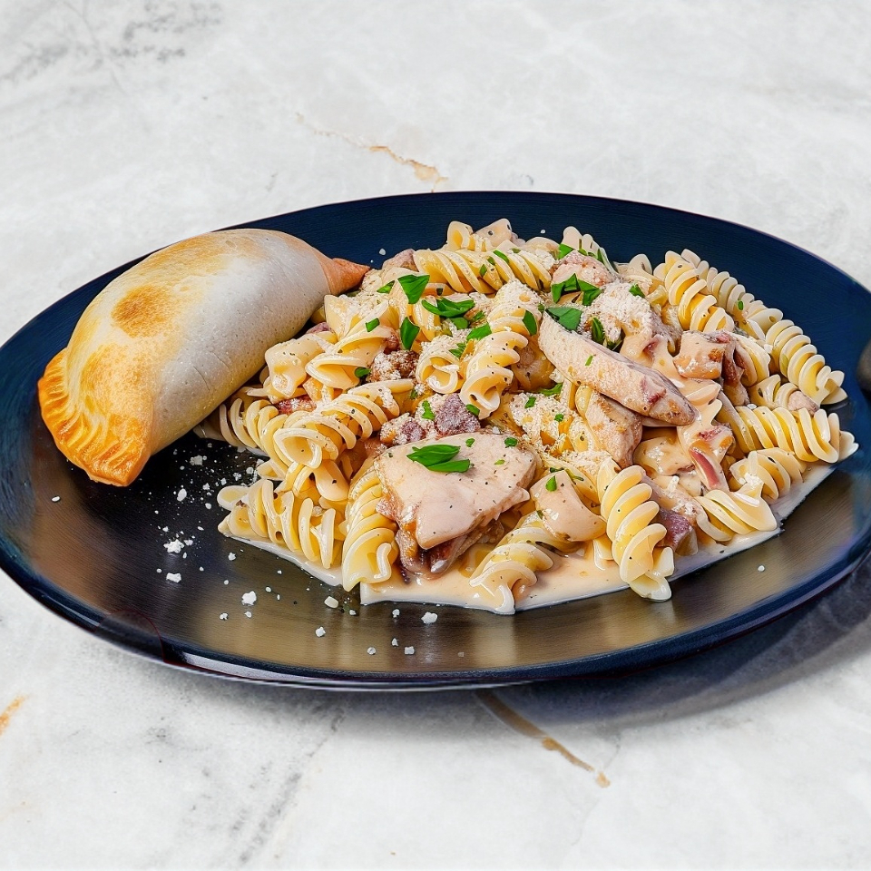 Pasta con salsa cremosa de vino blanco, con un toque de chipotle, tocino y pechuga de pollo.