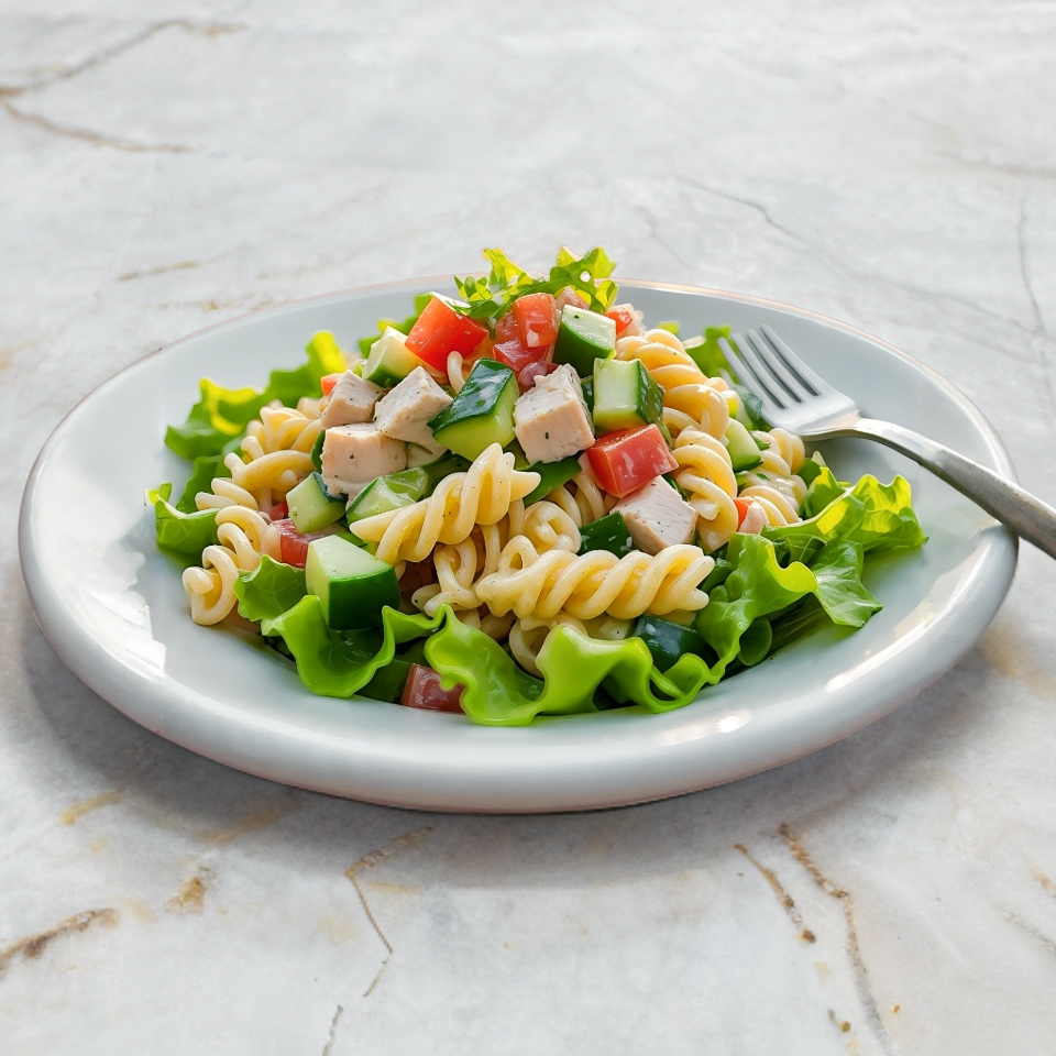 Mezcla de lechugas, ralladura de zanahoria, pasta con aderezo cremoso con elote, pepino, jitomate, y pimiento, pechuga de pollo en juliana o atún.