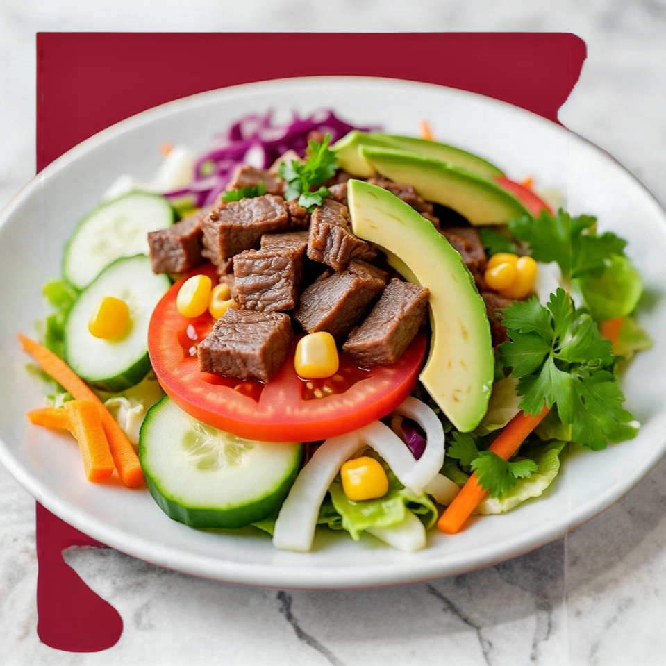 Mezcla de lechugas, ralladura de zanahoria, jícama, pepino, jitomate, col morada y elote juliana de arrachera y láminas de aguacate.