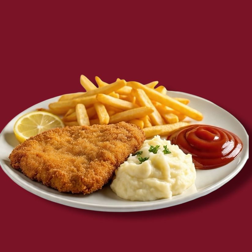 Pechuga de pollo empanizada, con papas a la francesa y pure de papas