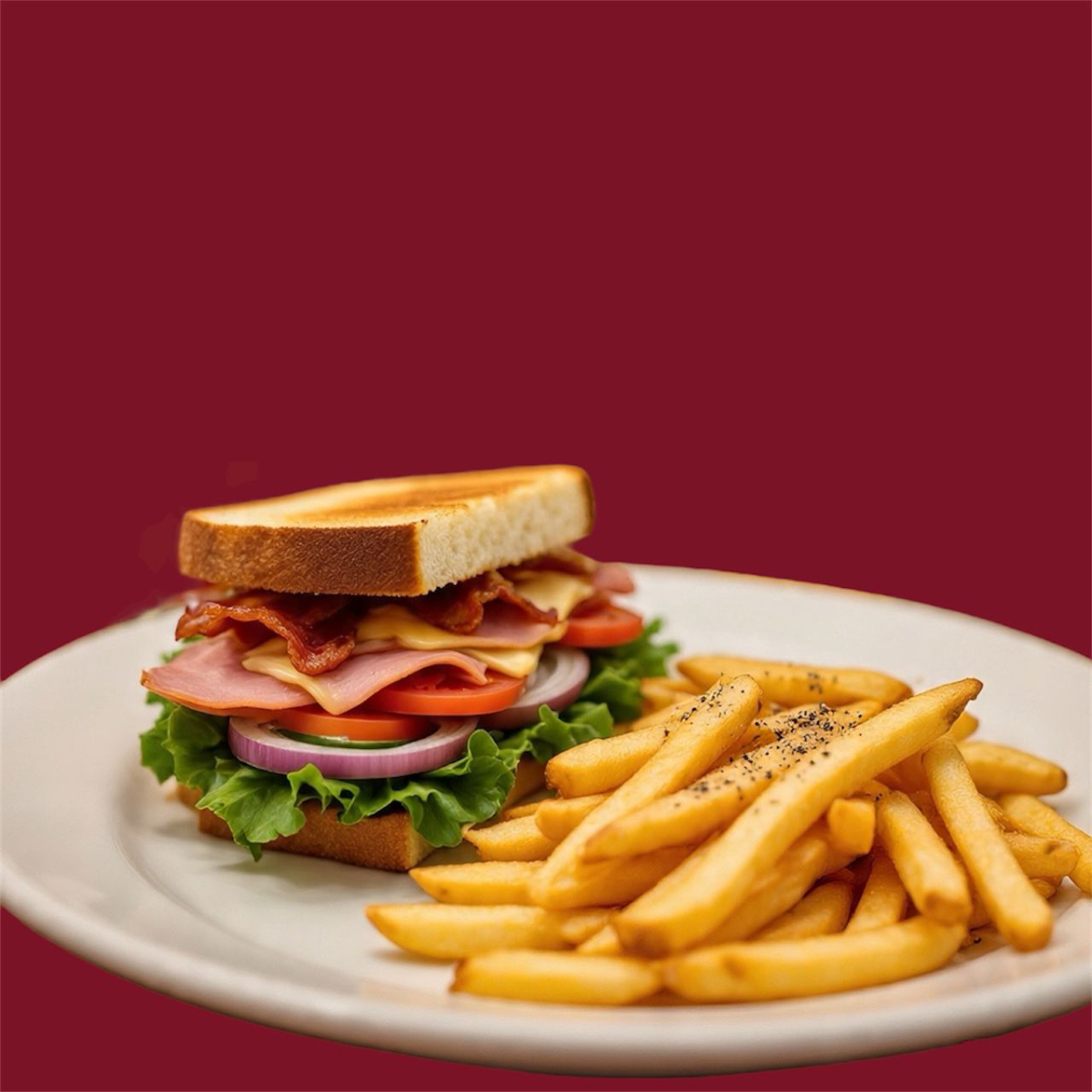 Sándwich masa madre jamón de pierna, tocino, queso americano y queso amarillo premium. incluye papas