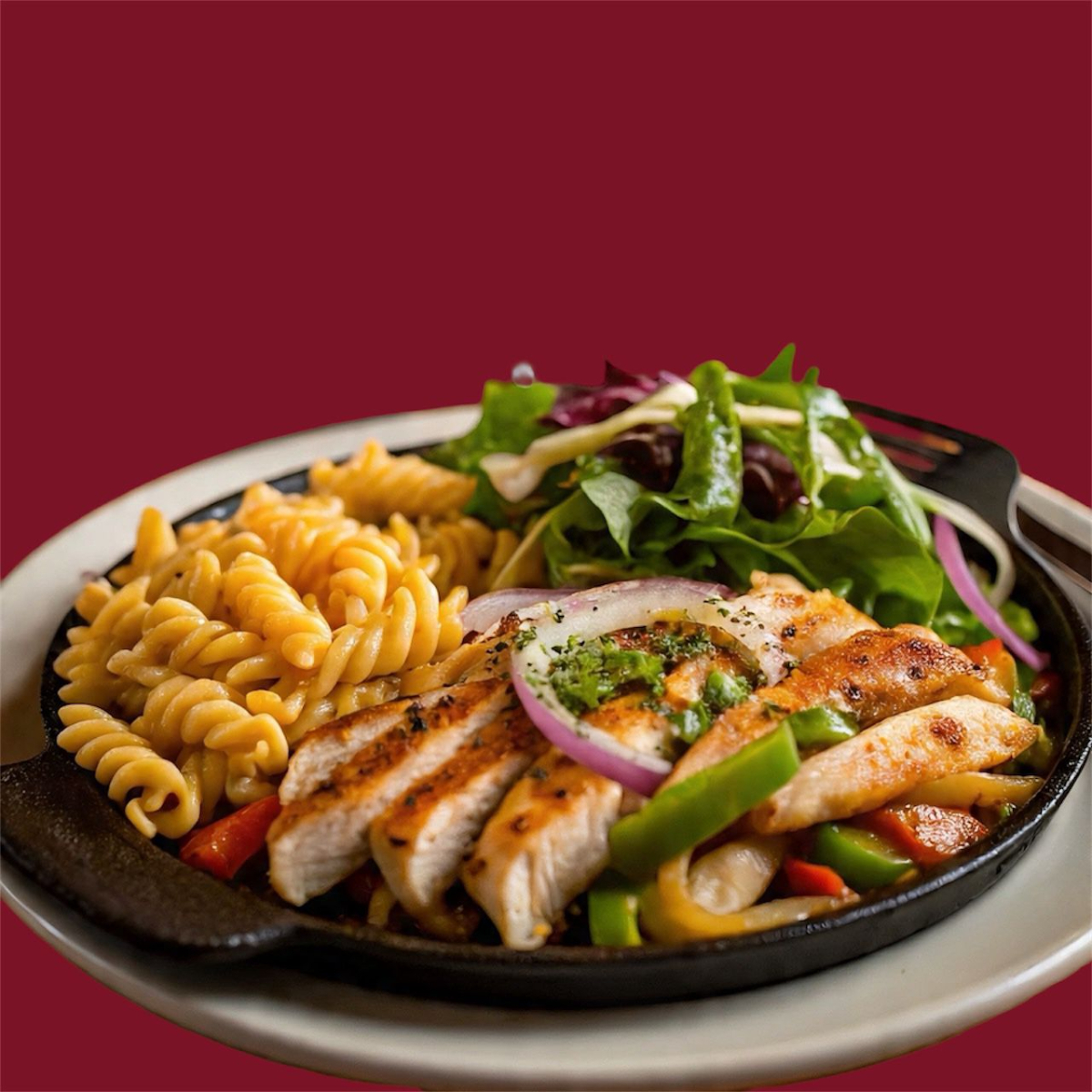 Pimiento, cebolla, jitomate y fajitas de pechuga , pasta cremosa y ensalda mixta de guarniciones