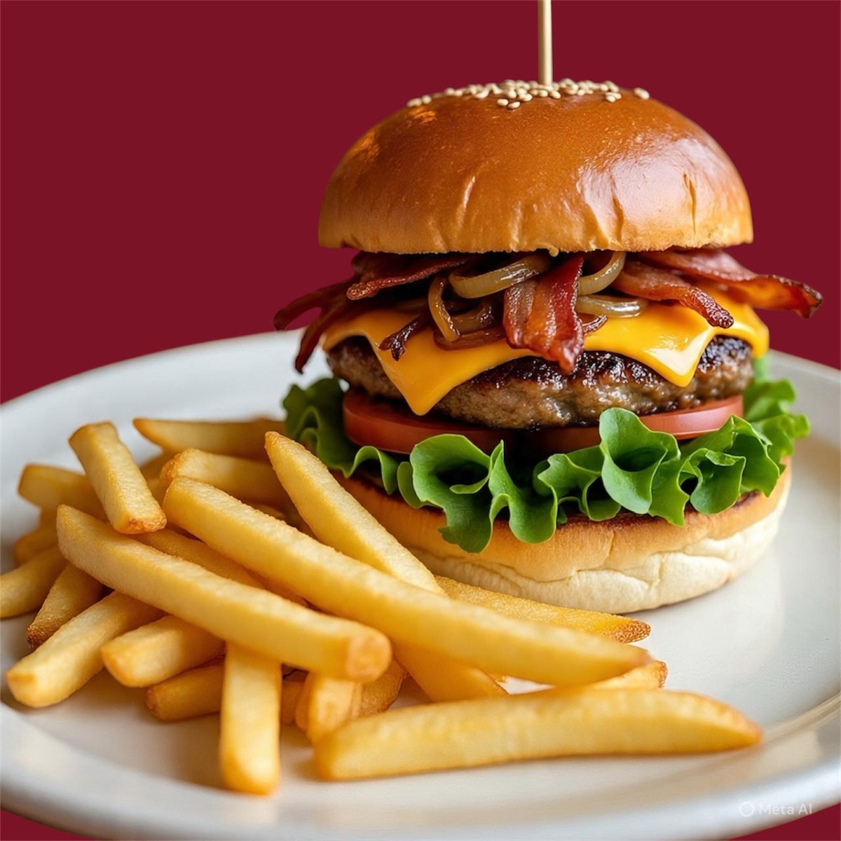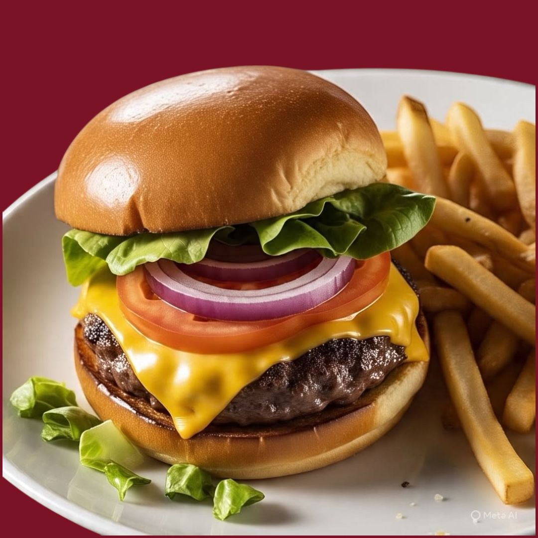 Hamburguesa con pan artesanal, queso premium y carne fresca, tocino y papas a la francesa