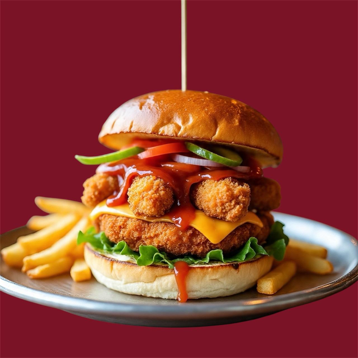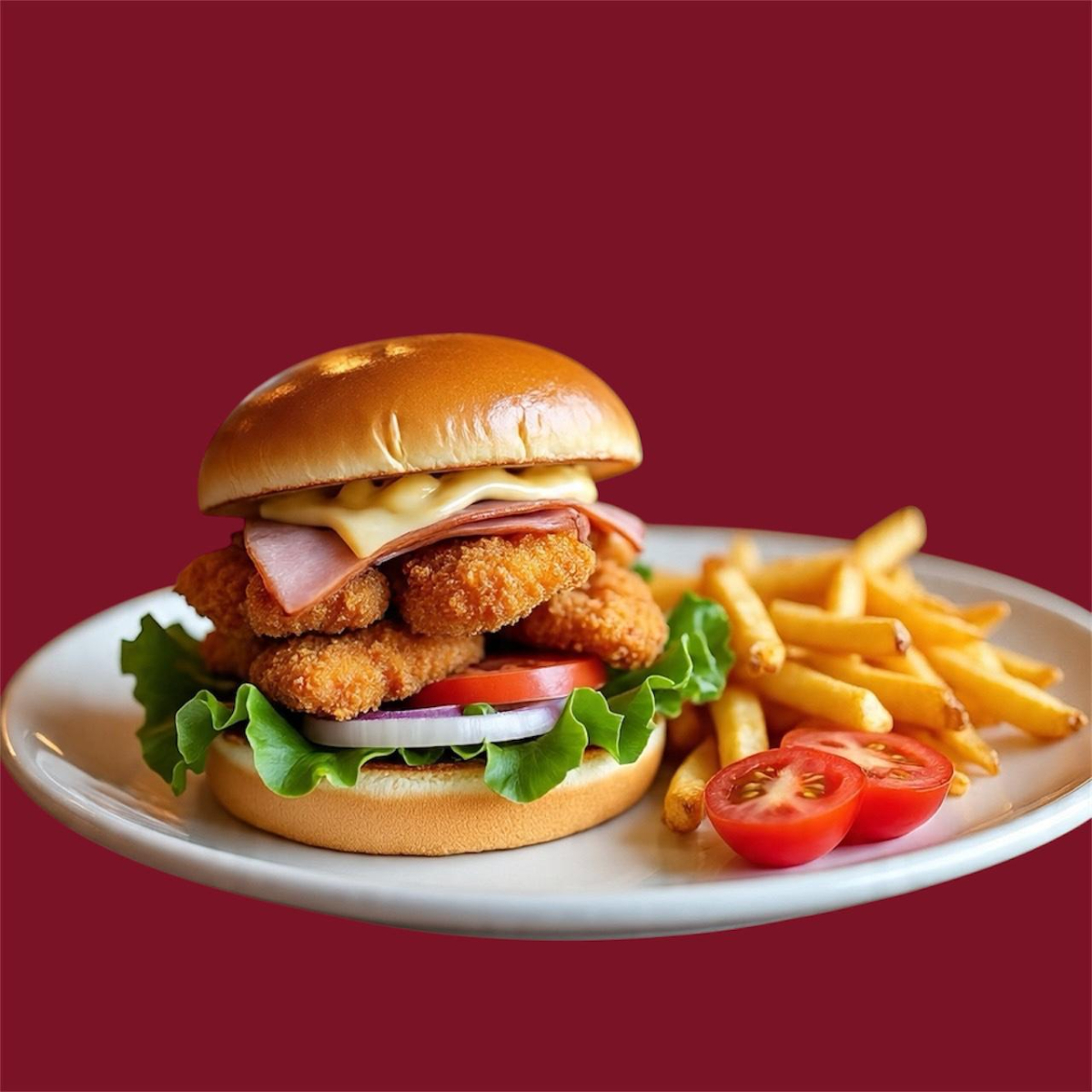 Hamburguesa con pan artesanal, queso premium boneles de pollo y papas la francesa
