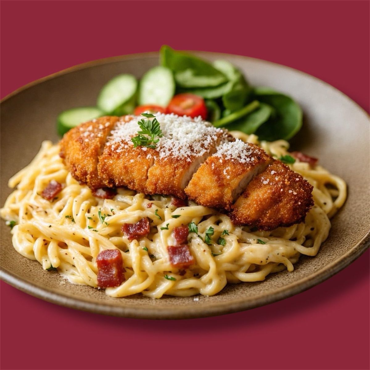 Pasta cremosa con tocino con una pieza de milanesa y ensalada mixta de guarnicion