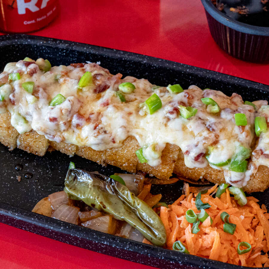Pollo relleno de queso crema, pepino, aguacate, proteína a elegir, bañado en mayonesa picante, queso fundido y coronado con cebolla crujiente.
