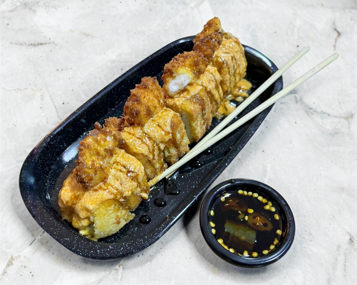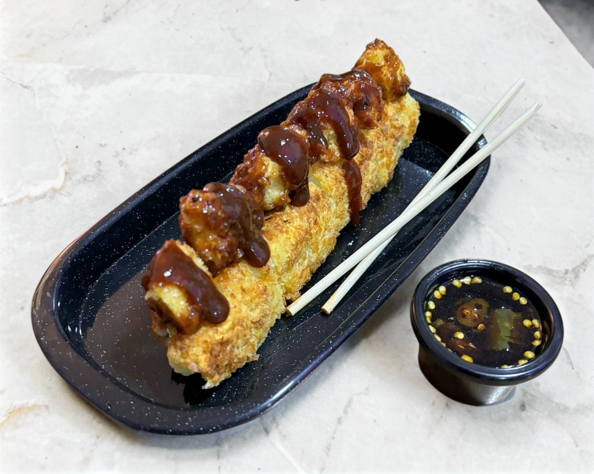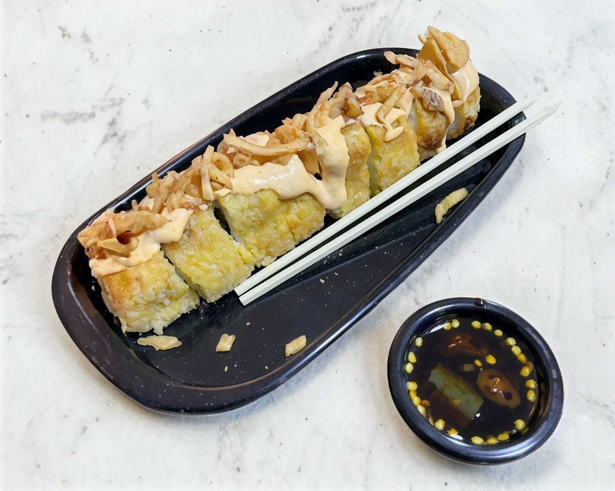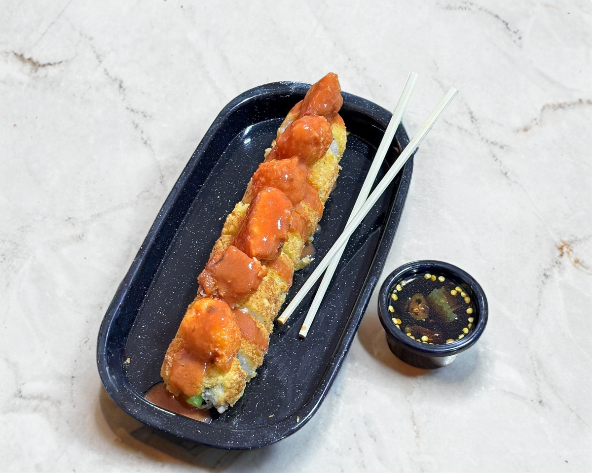 Rollo empanizado, relleno de queso crema, pepino, aguacate, coronado de boneless bañados en salsa de BBQ.