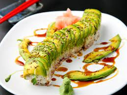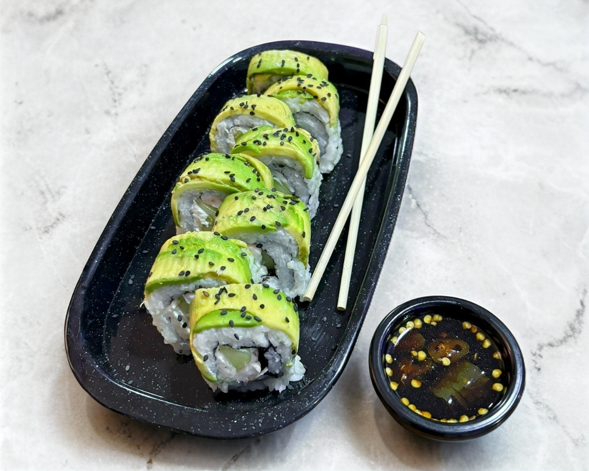 Rollo relleno de queso crema, pepino, proteína a elegir, cubierto con aguacate y ajonjolí.